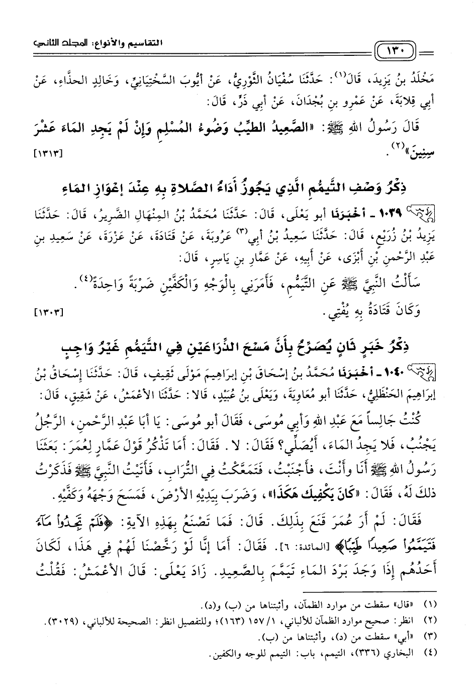 ١٠٤٠ - أَخبَرنا مُحَمَّدُ بْنُ إِسْحَاقَ بْنِ إِبْرَاهِيمَ، مَوْلَى ثَقِيفٍ، قَالَ: حَدثنا إِسْحَاقُ بْنُ إِبْرَاهِيمَ الْحَنْظَلِيُّ، حَدثنا أَبُو مُعَاوِيَةَ، وَيَعْلَى بْنُ عُبَيْدٍ، قَالَا: حَدثنا الأَعْمَشُ، عَنْ شَقِيقٍ، قَالَ: كُنْتُ جَالِسًا مَعَ عَبْدِ اللهِ وَأَبِي مُوسَى، فَقَالَ أَبُو مُوسَى: يَا أَبَا عَبْدِ الرَّحْمَنِ، الرَّجُلُ يَجْنُبُ فَلَا يَجِدُ الْمَاءَ أَيُصَلِّي؟ فَقَالَ: لَا، فَقَالَ: أَمَا تَذْكُرُ قَوْلَ عَمَّارٍ لِعُمَرَ: بَعَثَنَا رَسُولُ اللهِ صَلى الله عَلَيه وسَلم أَنَا وَأَنْتَ، فَأَجْنَبْتُ فَتَمَعَّكْتُ فِي التُّرَابِ، فَأَتَيْتُ النَّبِيَّ صَلى الله عَلَيه وسَلم، فَذَكَرْتُ ذَلِكَ لَهُ، فَقَالَ: "كَانَ يَكْفِيكَ هَكَذَا"، وَضَرَبَ بِيَدَيْهِ الأَرْضَ فَمَسَحَ وَجْهَهُ وَكَفَّيْهِ. فَقَالَ: لَمْ أَرَ عُمَرَ قَنَعَ بِذَلِكَ، قَالَ: فَمَا تَصْنَعُ بِهَذِهِ الآيَةِ: {فَلَمْ تَجِدُوا مَاءً فَتَيَمَّمُوا صَعِيدًا طَيِّبًا} [المائدة: ٦]. فَقَالَ: أَمَا إِنَّا لَوْ رَخَّصْنَا لَهُمْ فِي هَذَا لَكَانَ أَحَدُهُمْ إِذَا وَجَدَ بَرْدَ الْمَاءِ تَيَمَّمَ بِالصَّعِيدِ، زَادَ يَعْلَى: قَالَ الأَعْمَشُ: فَقُلْتُ لِشَقِيقٍ فَلَمْ يَكُنْ هَذَا إِلَاّ لِهَذَا. [١٣٠٤]