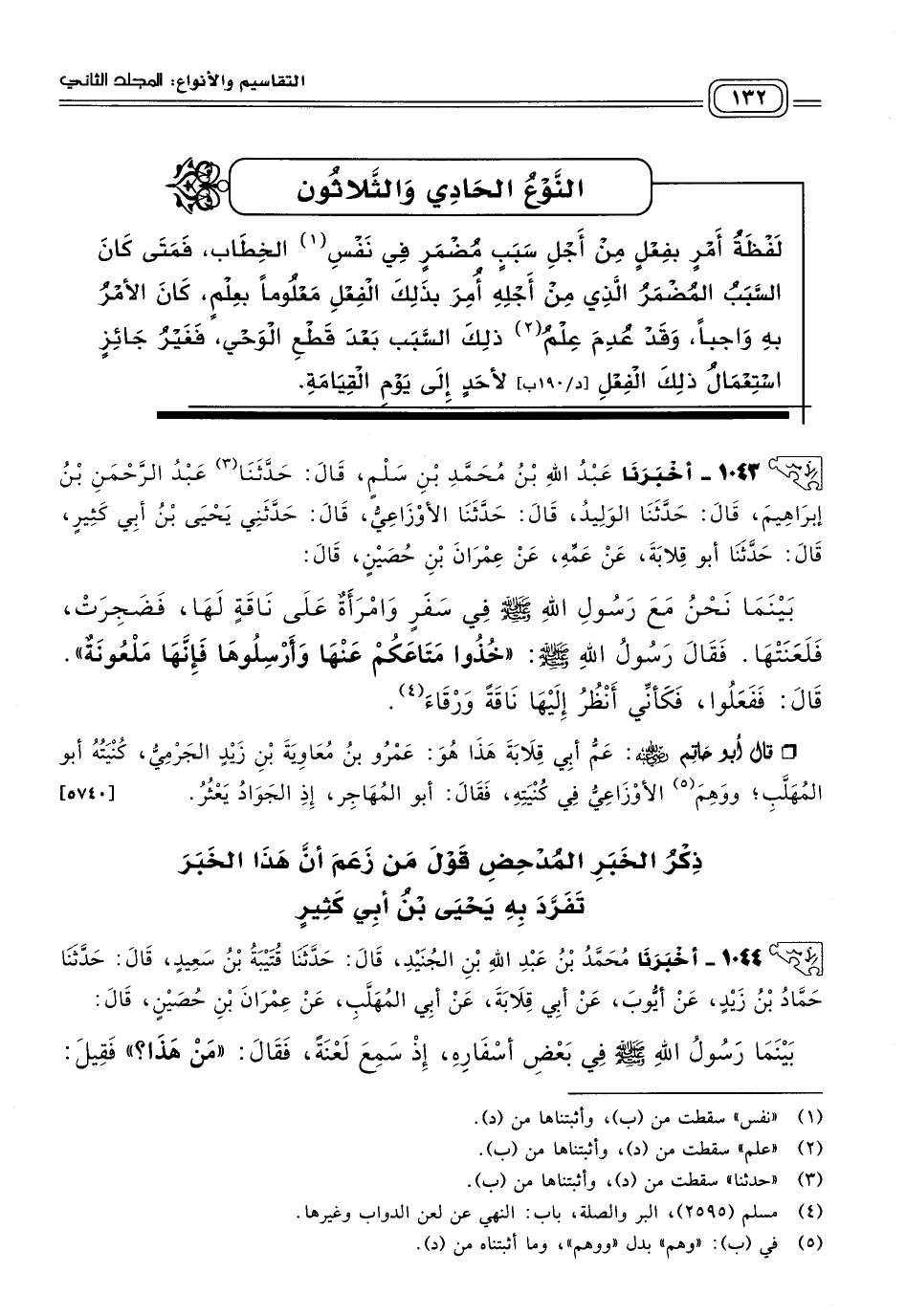 قَالَ أَبُو حَاتِمٍ رَضِيَ اللهُ عَنْهُ: عَمُّ أَبِي قِلَابَةَ هَذَا: هُوَ عَمْرُو بْنُ مُعَاوِيَةَ بْنِ زَيْدٍ الْجَرْمِيُّ، كُنْيَتُهُ أَبُو الْمُهَلَّبِ، وَوَهِمَ الأَوْزَاعِيُّ فِي كُنْيَتِهِ، فَقَالَ: أَبُو الْمُهَاجِرِ، إِذِ الْجَوَادُ يَعْثُرُ. [٥٧٤٠]