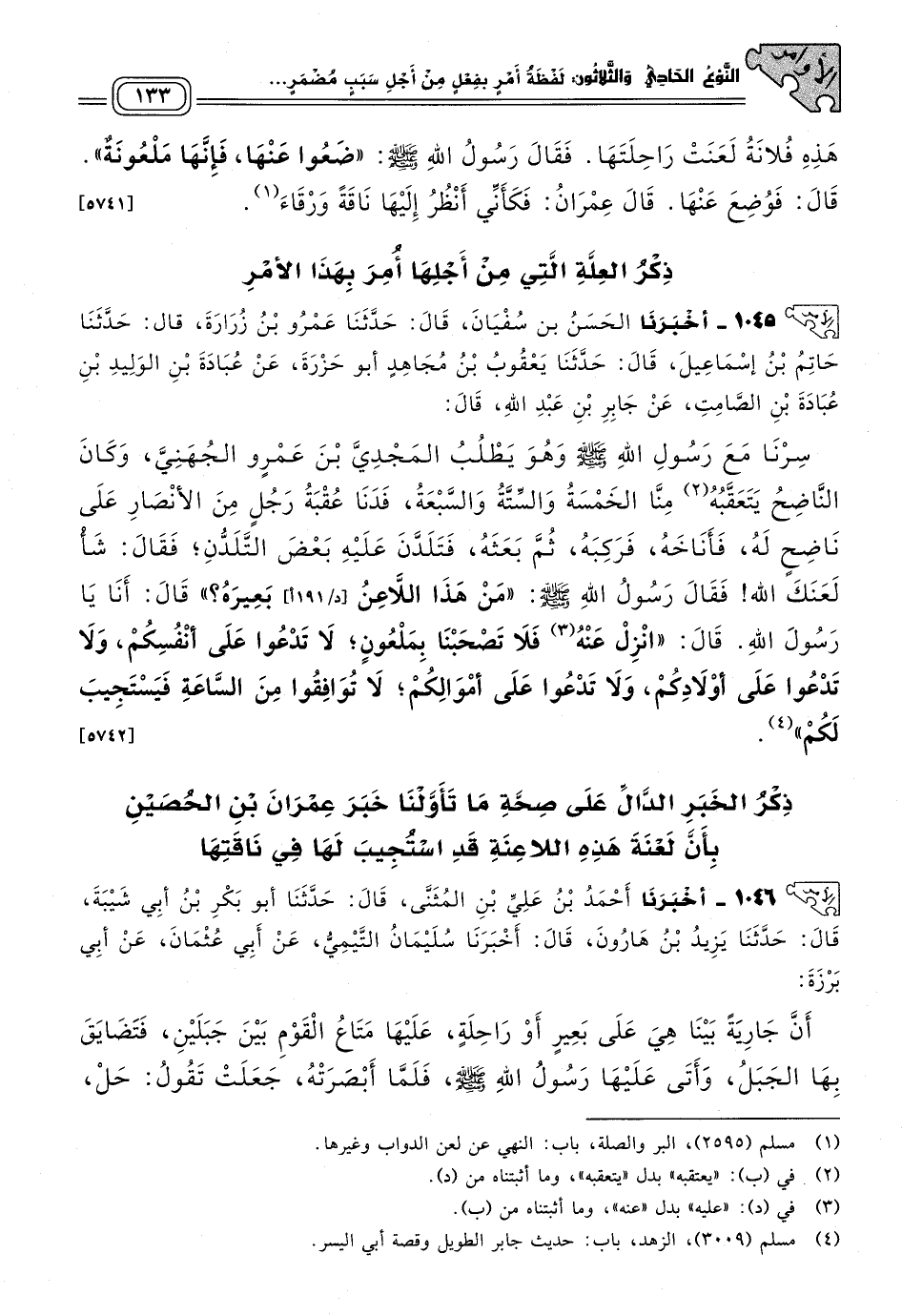 ١٠٤٥ - أَخبَرنا الْحَسَنُ بْنُ سُفْيَانَ، قَالَ: حَدثنا عَمْرُو بْنُ زُرَارَةَ، قَالَ: حَدثنا حَاتِمُ بْنُ إِسْمَاعِيلَ، قَالَ: حَدثنا يَعْقُوبُ بْنُ مُجَاهِدٍ أَبُو حَزْرَةَ، عَنْ عُبَادَةَ بْنِ الْوَلِيدِ بْنِ عُبَادَةَ بْنِ الصَّامِتِ، عَنْ جَابِرِ بْنِ عَبْدِ اللهِ، قَالَ: سِرْنَا مَعَ رَسُولِ اللهِ صَلى الله عَلَيه وسَلم وَهُوَ يَطْلُبُ الْمَجْدِيَّ بْنَ عَمْرٍو الْجُهَنِيَّ، وَكَانَ النَّاضِحُ يتعقبه مِنَّا الْخَمْسَةُ، وَالسِّتَّةُ، وَالسَّبْعَةُ، فَدَنَا عُقْبَةُ رَجُلٍ مِنَ الأَنْصَارِ عَلَى نَاضِحٍ لَهُ، فَأَنَاخَهُ فَرَكِبَهُ، ثُمَّ بَعَثَهُ، فَتَلَدَّنَ عَلَيْهِ بَعْضَ التَّلَدُّنِ، فَقَالَ: شَأْ لَعَنَكَ اللهُ، فَقَالَ رَسُولُ اللهِ صَلى الله عَلَيه وسَلم: "مَنْ هَذَا اللَاّعِنُ بَعِيرَهُ؟ " قَالَ: أَنَا يَا رَسُولَ اللهِ، قَالَ: "انْزِلْ عَنْهُ، فَلَا تَصْحَبْنَا بِمَلْعُونٍ، لَا تَدْعُوا عَلَى أَنْفُسِكُمْ، وَلَا تَدْعُوا عَلَى أَوْلَادِكُمْ، وَلَا تَدْعُوا عَلَى أَمْوَالِكُمْ، لَا تُوَافِقُوا مِنَ السَّاعَةِ فَيَسْتَجِيبَ لَكُمْ". [٥٧٤٢]