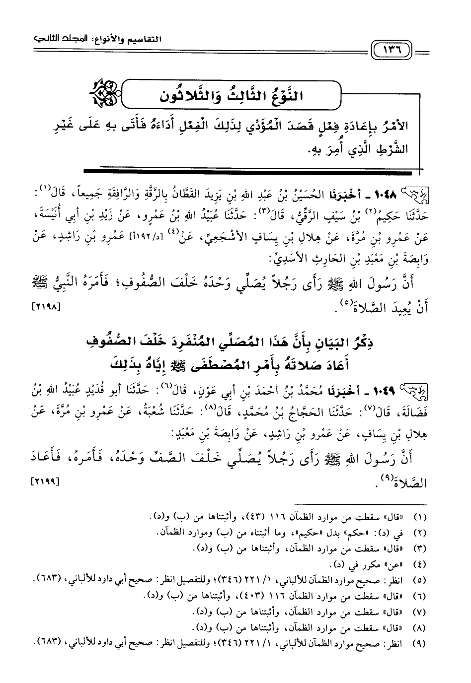 ١٠٤٨ - أَخبَرنا الْحُسَيْنُ بْنُ عَبْدِ اللهِ بْنِ يَزِيدَ الْقَطَّانُ، بِالرَّقَّةِ وَالرَّافِقَةِ جَمِيعًا، قَالَ: حَدثنا حَكِيمُ بْنُ سَيْفٍ الرَّقِّيُّ، قَالَ: حَدثنا عُبَيْدُ اللهِ بْنُ عَمْرٍو، عَنْ زَيْدِ بْنِ أَبِي أُنَيْسَةَ، عَنْ عَمْرِو بْنِ مُرَّةَ، عَنْ هِلَالِ بْنِ يَسَافٍ الأَشْجَعِيِّ، عَنْ عَمْرِو بْنِ رَاشِدٍ، عَنْ وَابِصَةَ بْنِ مَعْبَدِ بْنِ الْحَارِثِ الأَسَدِيِّ؛ أَنَّ رَسُولَ اللهِ صَلى الله عَلَيه وسَلم رَأَى رَجُلاً يُصَلِّي وَحْدَهُ خَلْفَ الصُّفُوفِ، فَأَمَرَهُ النَّبِيُّ صَلى الله عَلَيه وسَلم أَنْ يُعِيدَ الصَّلَاةَ. [٢١٩٨]