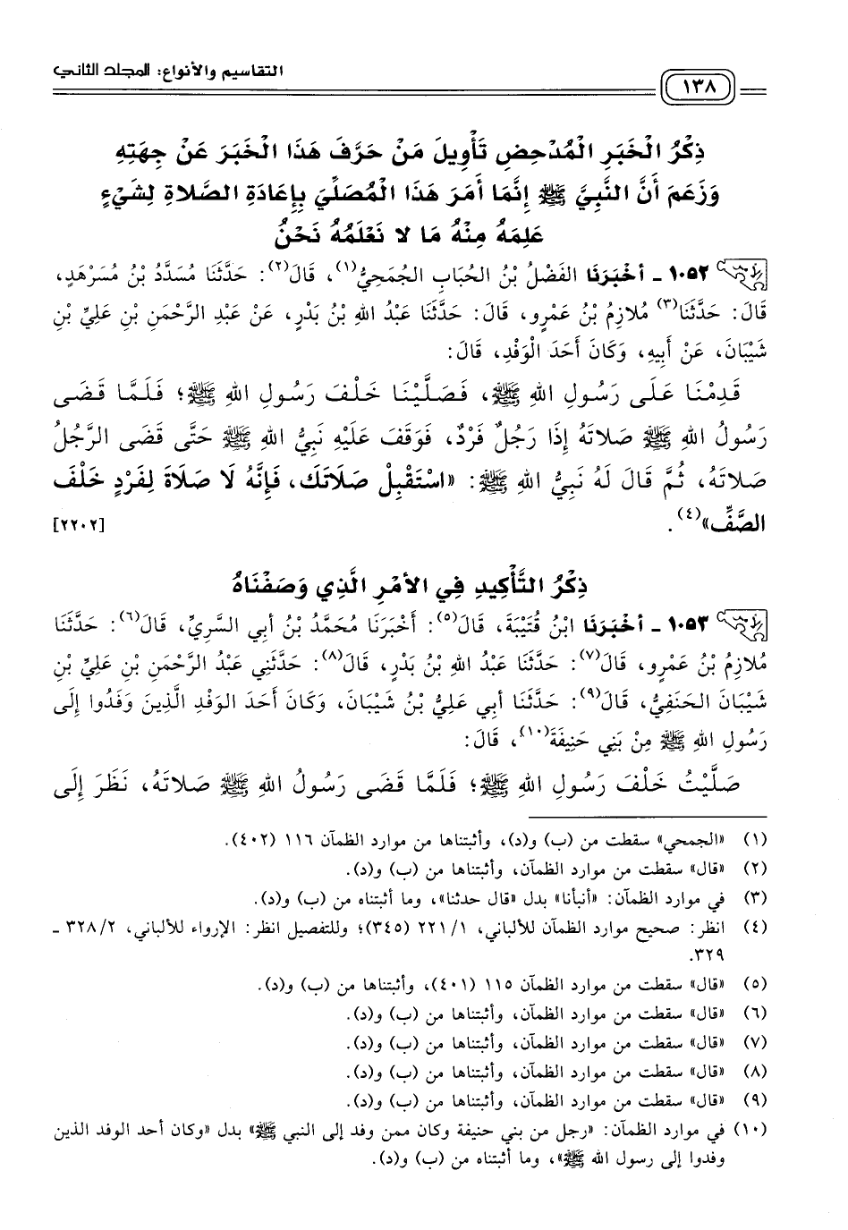 ١٠٥٢ - أَخبَرنا الْفَضْلُ بْنُ الْحُبَابِ الجمحي، قَالَ: حَدثنا مُسَدَّدُ بْنُ مُسَرْهَدٍ، قَالَ: حَدثنا مُلَازِمُ بْنُ عَمْرٍو، قَالَ: حَدثنا عَبْدُ اللهِ بْنُ بَدْرٍ، عَنْ عَبْدِ الرَّحْمَنِ بْنِ عَلِيِّ بْنِ شَيْبَانَ، عَنْ أَبِيهِ، وَكَانَ أَحَدَ الْوَفْدِ قَالَ: قَدِمْنَا عَلَى رَسُولِ اللهِ صَلى الله عَلَيه وسَلم، فَصَلَّيْنَا خَلْفَ رَسُولِ اللهِ صَلى الله عَلَيه وسَلم، فَلَمَّا قَضَى رَسُولُ اللهِ صَلى الله عَلَيه وسَلم صَلَاتَهُ إِذَا رَجُلٌ فَرْدٌ فَوَقَفَ عَلَيْهِ نَبِيُّ اللهِ صَلى الله عَلَيه وسَلم حَتَّى قَضَى الرَّجُلُ صَلَاتَهُ، ثُمَّ قَالَ لَهُ نَبِيُّ اللهِ صَلى الله عَلَيه وسَلم: "اسْتَقْبِلْ صَلَاتَكَ؛ فَإِنَّهُ لَا صَلَاةَ لِفَرْدٍ خَلْفَ الصَّفِّ". [٢٢٠٢]