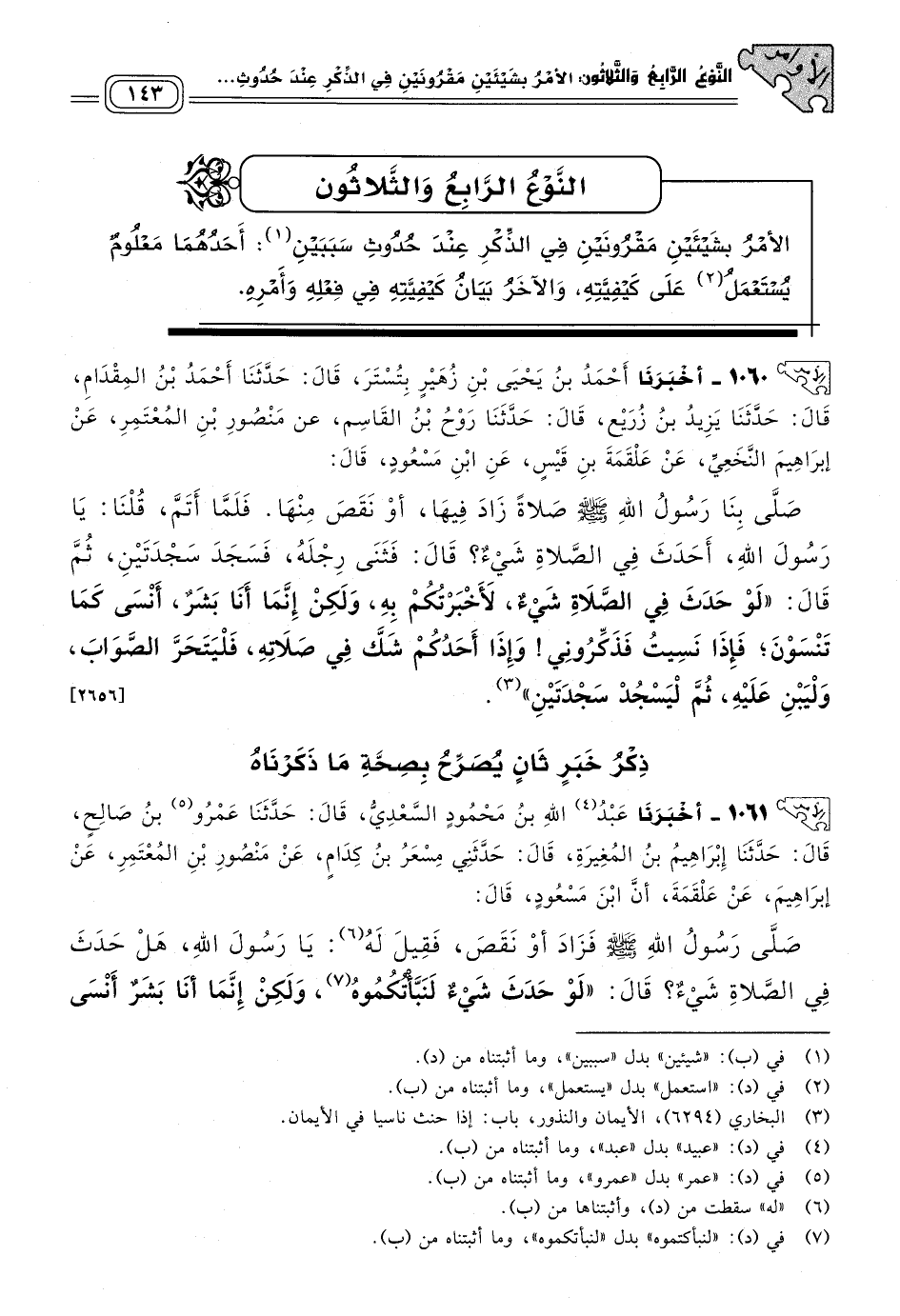 ١٠٦١ - أَخبَرنا عَبْدُ اللهِ بْنُ مَحْمُودٍ السَّعْدِيُّ، قَالَ: حَدثنا عَمْرُو بْنُ صَالِحٍ، قَالَ: حَدثنا إِبْرَاهِيمُ بْنُ الْمُغِيرَةِ، قَالَ: حَدَّثَنِي مِسْعَرُ بْنُ كِدَامٍ، عَنْ مَنْصُورِ بْنِ الْمُعْتَمِرِ، عَنْ إِبْرَاهِيمَ، عَنْ عَلْقَمَةَ، أَنَّ ابْنَ مَسْعُودٍ، قَالَ: صَلَّى رَسُولُ اللهِ صَلى الله عَلَيه وسَلم فَزَادَ، أَوْ نَقَصَ، فَقِيلَ لَهُ: يَا رَسُولَ اللهِ، هَلْ حَدَثَ فِي الصَّلَاةِ شَيْءٌ؟ قَالَ: "لَوْ حَدَثَ شَيْءٌ لَنَبَّأْتُكُمُوهُ، وَلَكِنْ إِنَّمَا أَنَا بَشَرٌ أَنْسَى كَمَا تَنْسَوْنَ، فَأَيُّكُمْ شَكَّ فِي صَلَاتِهِ فَلْيَنْظُرْ أَحْرَى ذَلِكَ إِلَى الصَّوَابِ فَلْيُتِمَّ عَلَيْهِ، ثُمَّ يَقُومُ فَلْيَسْجُدْ سَجْدَتَيْنِ".