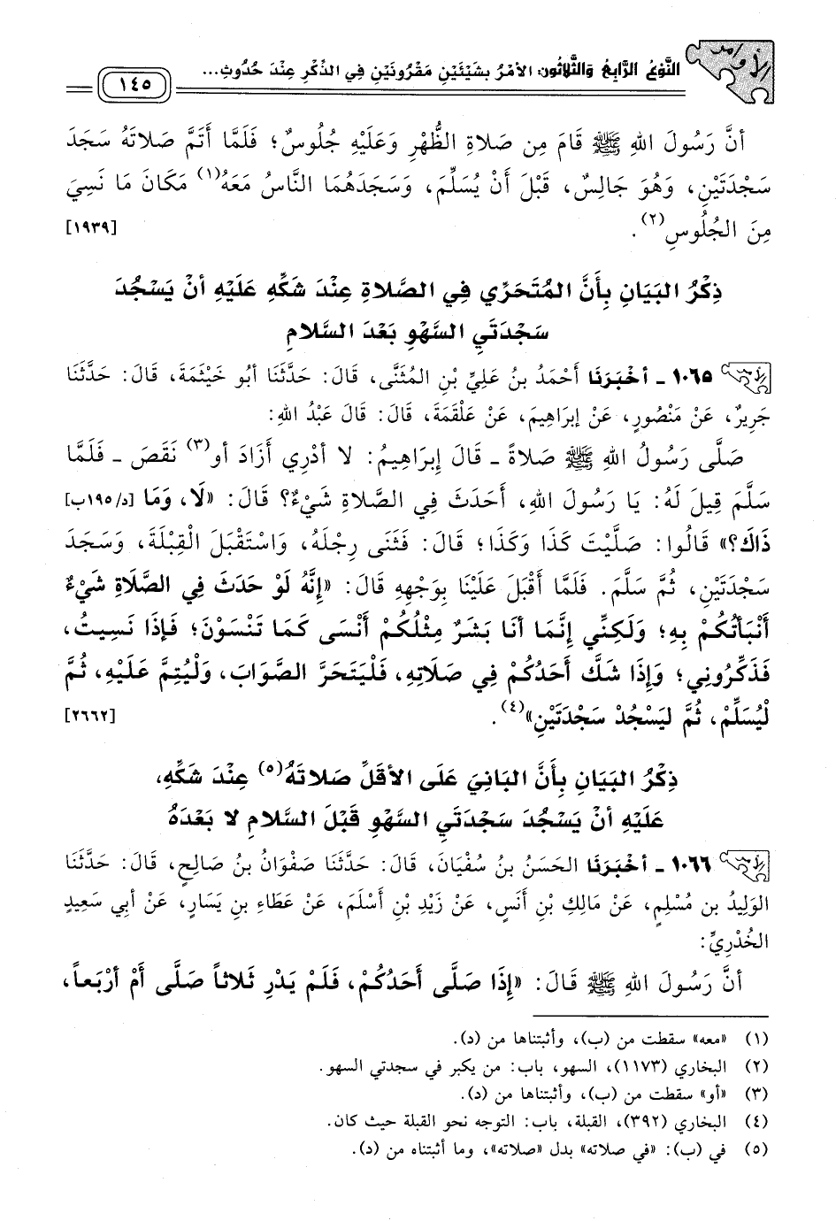 ١٠٦٥ - أَخْبَرَنَا أَحْمَدُ بْنُ عَلِيِّ بْنِ الْمُثَنَّى، قَالَ: حَدَّثَنَا أَبُو خَيْثَمَةَ، قَالَ: حَدَّثَنَا جَرِيرٌ، عَنْ مَنْصُورٍ، عَنْ إِبْرَاهِيمَ، عَنْ عَلْقَمَةَ، قَالَ: قَالَ عَبْدُ اللهِ: صَلَّى رَسُولُ اللهِ صَلَّى اللَّهُ عَلَيْهِ وَسَلَّمَ صَلَاةً -قَالَ إِبْرَاهِيمُ: لَا أَدْرِي أَزَادَ أو نَقَصَ- فَلَمَّا سَلَّمَ قِيلَ لَهُ: يَا رَسُولَ اللهِ، أَحَدَثَ فِي الصَّلَاةِ شَيْءٌ؟ قَالَ: "لَا، وَمَا ذَاكَ؟ " قَالُوا: صَلَّيْتَ كَذَا وَكَذَا، قَالَ: فَثَنَى رِجْلَهُ، وَاسْتَقْبَلَ الْقِبْلَةَ، وَسَجَدَ سَجْدَتَيْنِ ثُمَّ سَلَّمَ، فَلَمَّا أَقْبَلَ عَلَيْنَا بِوَجْهِهِ، قَالَ: "إِنَّهُ لَوْ حَدَثَ فِي الصَّلَاةِ شَيْءٌ أَنْبَأْتُكُمْ بِهِ، وَلَكِنِّي إِنَّمَا أَنَا بَشَرٌ مِثْلُكُمْ، أَنْسَى كَمَا تَنْسَوْنَ، فَإِذَا نَسِيتُ فَذَكِّرُونِي، وَإِذَا شَكَّ أَحَدُكُمْ فِي صَلَاتِهِ، فَلْيَتَحَرَّ الصَّوَابَ، وَلْيُتِمَّ عَلَيْهِ، ثُمَّ لْيُسَلِّمْ، ثُمَّ لْيَسْجُدْ سَجْدَتَيْنِ". [٢٦٦٢]