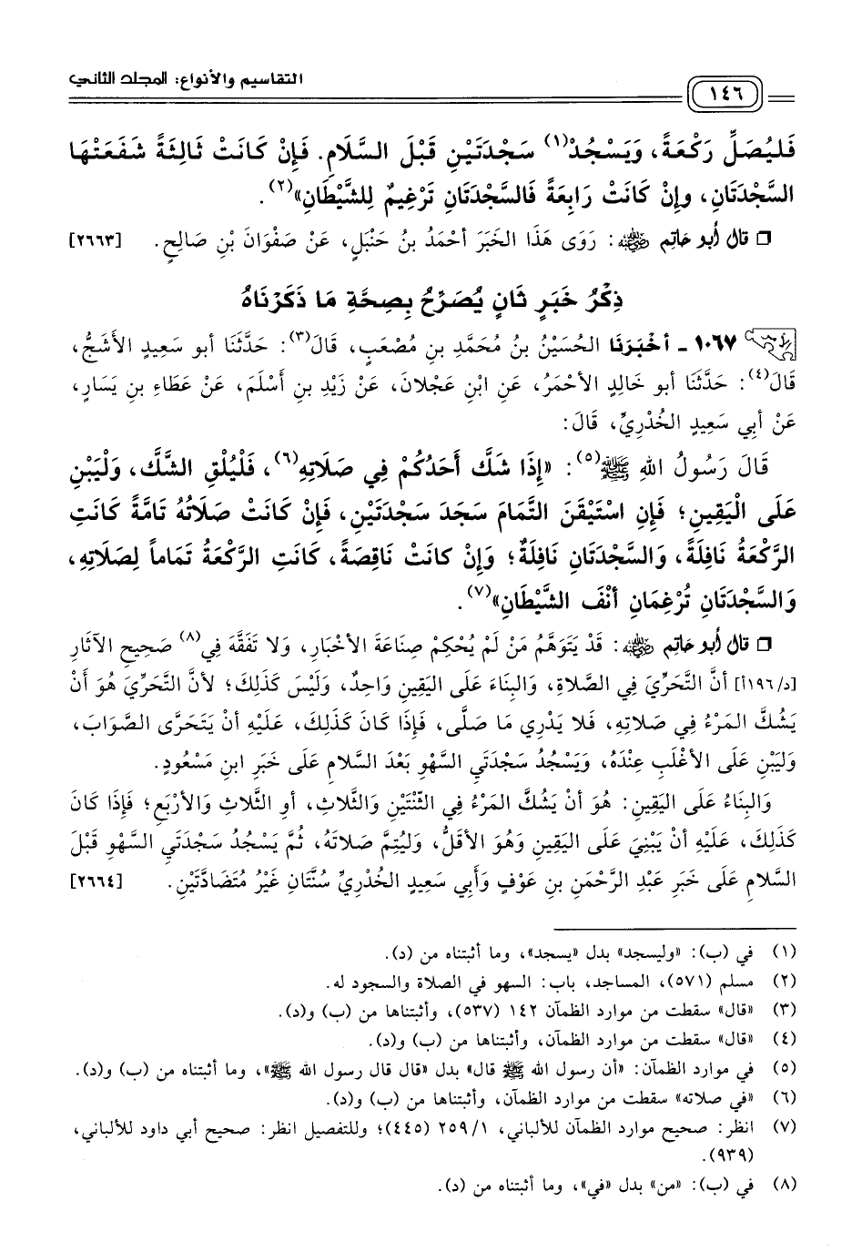 قَالَ أَبُو حَاتِمٍ رَضِيَ اللَّهُ عَنْهُ: قَدْ يَتَوَهَّمُ مَنْ لَمْ يُحْكِمْ صِنَاعَةَ الأَخْبَارِ، وَلَا تَفَقَّهَ في صَحِيحِ الآثَارِ، أَنَّ التَّحَرِّيَ فِي الصَّلَاةِ وَالْبِنَاءَ عَلَى الْيَقِينِ وَاحِدٌ، وَلَيْسَ كَذَلِكَ، لأَنَّ التَّحَرِّيَ هُوَ أَنْ يَشُكَّ الْمَرْءُ فِي صَلَاتِهِ، فَلَا يَدْرِي مَا صَلَّى، فَإِذَا كَانَ كَذَلِكَ، عَلَيْهِ أَنْ يَتَحَرَّى الصَّوَابَ، وَلْيَبْنِ عَلَى الأَغْلَبِ عِنْدَهُ، وَيَسْجُدْ سَجْدَتَيِ السَّهْوِ بَعْدَ السَّلَامِ عَلَى خَبَرِ ابْنِ مَسْعُودٍ.