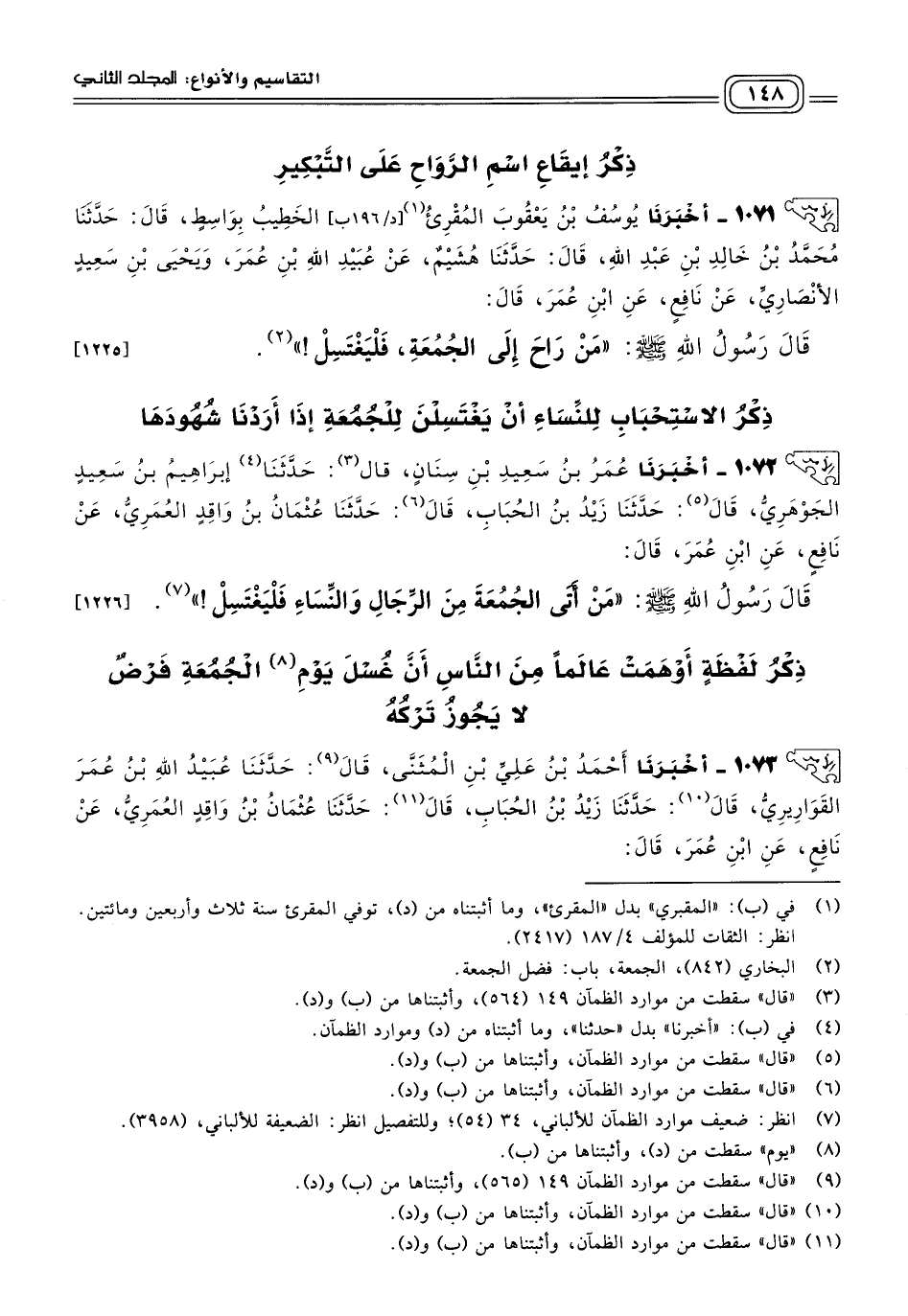 ١٠٧٣ - أَخبَرنا أَحْمَدُ بْنُ عَلِيِّ بْنِ الْمُثَنَّى، قَالَ: حَدثنا عُبَيْدُ اللهِ بْنُ عُمَرَ الْقَوَارِيرِيُّ، قَالَ: حَدثنا زَيْدُ بْنُ الْحُبَابِ، قَالَ: حَدثنا عُثْمَانُ بْنُ وَاقِدٍ الْعُمَرِيُّ، عَنْ نَافِعٍ، عَنِ ابْنِ عُمَرَ، قَالَ: قَالَ رَسُولُ اللهِ صَلى الله عَلَيه وسَلم: "الْغُسْلُ يَوْمَ الْجُمُعَةِ عَلَى كُلِّ حَالِمٍ مِنَ الرِّجَالِ، وَعَلَى كُلِّ بَالِغٍ مِنَ النِّسَاءِ". [١٢٢٧]