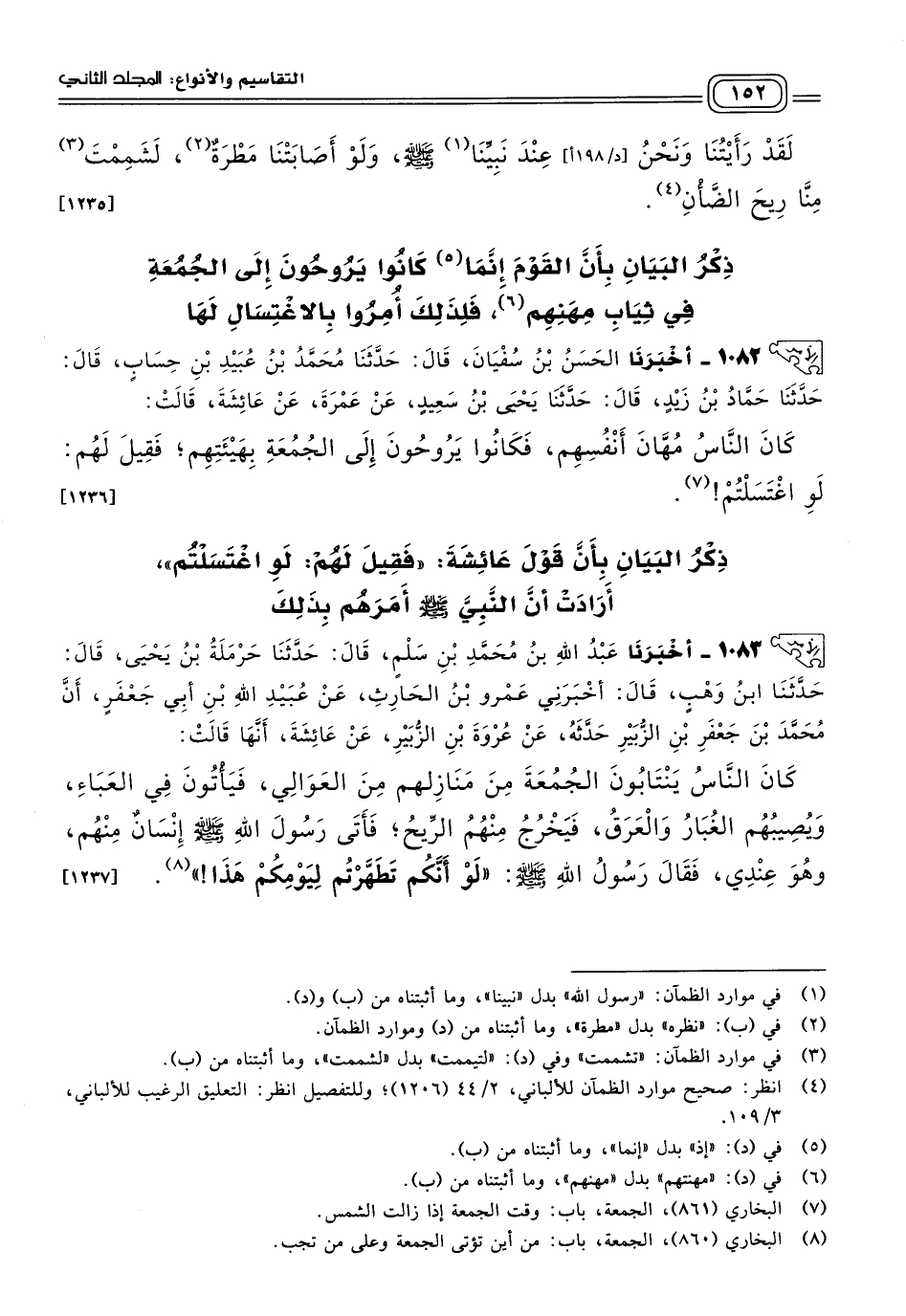 ١٠٨٢ - أَخبَرنا الْحَسَنُ بْنُ سُفْيَانَ، قَالَ: حَدثنا مُحَمَّدُ بْنُ عُبَيْدِ بْنِ حِسَابٍ، قَالَ: حَدثنا حَمَّادُ بْنُ زَيْدٍ، قَالَ: حَدثنا يَحْيَى بْنُ سَعِيدٍ، عَنْ عَمْرَةَ، عَنْ عَائِشَةَ، قَالَتْ: كَانَ النَّاسُ مُهَّانَ أَنْفُسِهِمْ، فَكَانُوا يَرُوحُونَ إِلَى الْجُمُعَةِ بِهَيْئَتِهِمْ، فَقِيلَ لَهُمْ: لَوِ اغْتَسَلْتُمْ. [١٢٣٦]