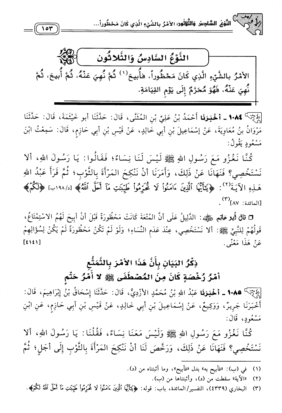 ١٠٨٥ - أَخبَرنا عَبْدُ اللهِ بْنُ مُحَمَّدٍ الأَزْدِيُّ، قَالَ: حَدثنا إِسْحَاقُ بْنُ إِبْرَاهِيمَ، قَالَ: أَخبَرنا جَرِيرٌ، وَوَكِيعٌ، عَنْ إِسْمَاعِيلَ بْنِ أَبِي خَالِدٍ، عَنْ قَيْسِ بْنِ أَبِي حَازِمٍ، عَنِ ابْنِ مَسْعُودٍ قَالَ: كُنَّا نَغْزُو مَعَ رَسُولِ اللهِ صَلى الله عَلَيه وسَلم وَلَيْسَ مَعَنَا نِسَاءٌ، فَقُلْنَا: يَا رَسُولَ اللهِ، أَلَا نَسْتَخْصِي؟ فَنَهَانَا عَنْ ذَلِكَ، وَرَخَّصَ لَنَا أَنْ نَنْكِحَ الْمَرْأَةَ بِالثَّوْبِ إِلَى أَجْلٍ، ثُمَّ قَرَأَ: {يَا أَيُّهَا الَّذِينَ آمَنُوا لَا تُحَرِّمُوا طَيِّبَاتِ مَا أَحَلَّ اللهُ لَكُمْ وَلَا تَعْتَدُوا إِنَّ اللهَ لَا يُحِبُّ الْمُعْتَدِينَ} [المائدة: ٨٧]. [٤١٤٢]