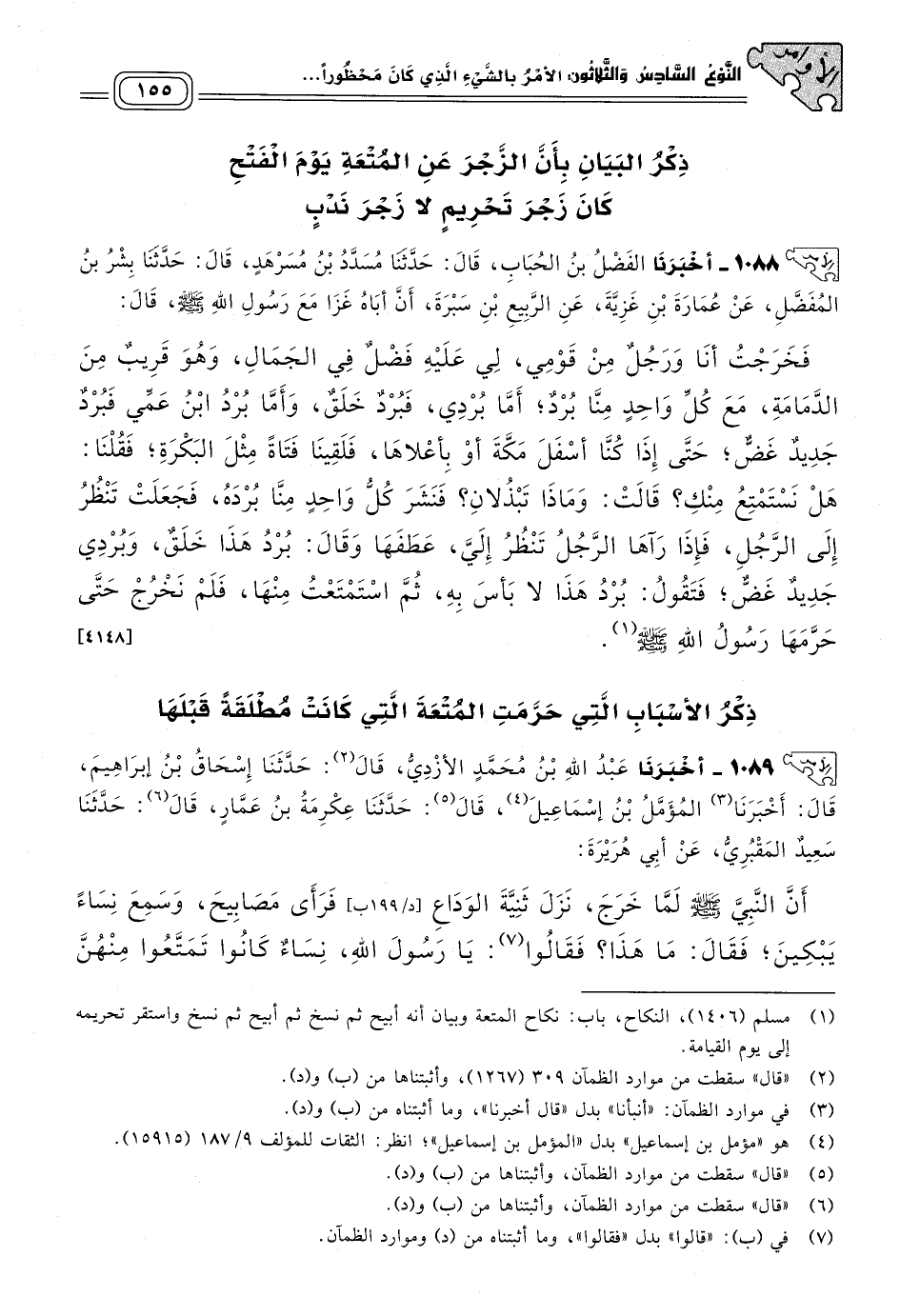 ١٠٨٨ - أَخبَرنا الْفَضْلُ بْنُ الْحُبَابِ، قَالَ: حَدثنا مُسَدَّدُ بْنُ مُسَرْهَدٍ، قَالَ: حَدثنا بِشْرُ بْنُ الْمُفَضَّلِ، عَنْ عُمَارَةَ بْنِ غَزِيَّةَ، عَنِ الرَّبِيعِ بْنِ سَبْرَةَ، أَنَّ أَبَاهُ غَزَا مَعَ رَسُولِ اللهِ صَلى الله عَلَيه وسَلم قَالَ: فَخَرَجْتُ أَنَا وَرَجُلٌ مِنْ قَوْمِي لِي عَلَيْهِ فَضْلٌ فِي الْجَمَالِ، وَهُوَ قَرِيبٌ مِنَ الدَّمَامَةِ، مَعَ كُلِّ وَاحِدٍ مِنَّا بُرْدٌ، أَمَا بُرْدِي فَبُرْدٌ خَلَقٌ، وَأَمَّا بُرْدُ ابْنِ عَمِّي فَبُرْدٌ جَدِيدٌ غَضٌّ، حَتَّى إِذَا كُنَّا أَسْفَلَ مَكَّةَ، أَوْ بِأَعْلَاهَا فَلَقَيْنَا فَتَاةً مِثْلَ الْبَكْرَةِ، فَقُلْنَا: هَلْ نَسْتَمْتِعُ مِنْكِ؟، قَالَتْ: وَمَاذَا تَبْذُلَانِ؟ فَنَشَرَ كُلُّ وَاحِدٍ مِنَّا بُرْدَهُ، فَجَعَلَتْ تَنْظُرُ إِلَى الرَّجُلِ، فَإِذَا رَآهَا الرَّجُلُ تَنْظُرُ إِلَيَّ عَطَفَهَا وَقَالَ: بُرْدُ هَذَا خَلَقٌ وَبُرْدِي جَدِيدٌ غَضٌّ، فَتَقُولُ: بُرْدُ هَذَا لَا بَأْسَ بِهِ، ثُمَّ اسْتَمْتَعْتُ مِنْهَا فَلَمْ نَخْرُجْ حَتَّى حَرَّمَهَا رَسُولُ اللهِ صَلى الله عَلَيه وسَلم. [٤١٤٨]