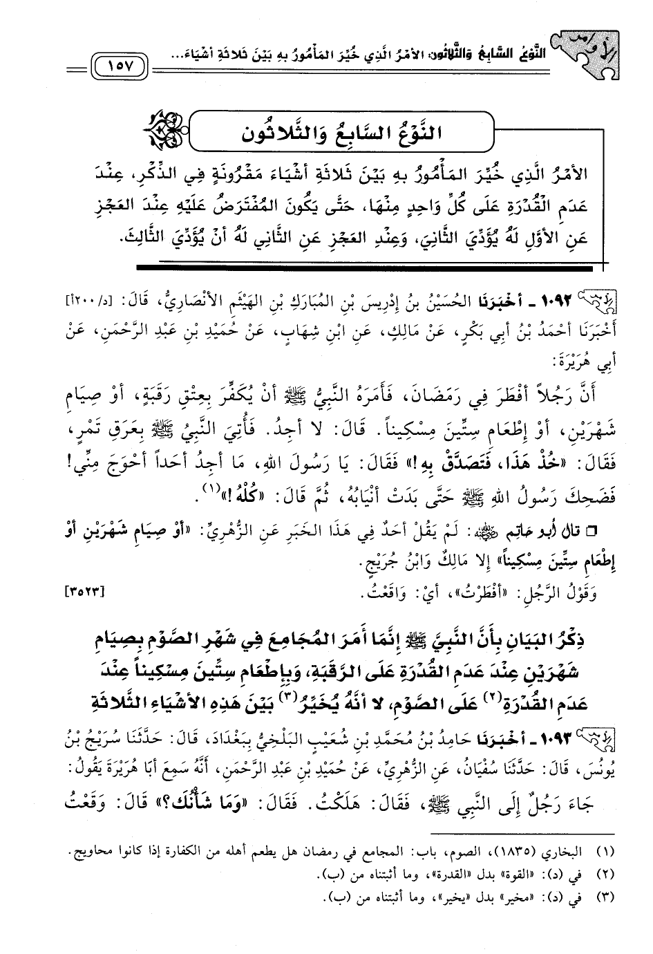 ١٠٩٣ - أَخبَرنا حَامِدُ بْنُ مُحَمَّدِ بْنِ شُعَيْبٍ الْبَلْخِيُّ، بِبَغْدَادَ، قَالَ: حَدثنا سُرَيْجُ بْنُ يُونُسَ، قَالَ: حَدثنا سُفْيَانُ، عَنِ الزُهْرِيِّ، عَنْ حُمَيْدِ بْنِ عَبْدِ الرَّحْمَنِ، أَنَّهُ سَمِعَ أَبَا هُرَيْرَةَ، يَقُولُ: جَاءَ رَجُلٌ إِلَى النَّبِيِّ صَلى الله عَلَيه وسَلم، فَقَالَ: هَلَكْتُ، فَقَالَ: "وَمَا شَأْنُكَ؟ " قَالَ: وَقَعْتُ عَلَى امْرَأَتِي، قَالَ: "فَهَلْ تَجِدُ مَا تَعْتِقُ رَقَبَةً؟ " قَالَ: لَا، قَالَ: "أَتَسْتَطِيعُ أَنْ تَصُومَ شَهْرَيْنِ مُتَتَابِعَيْنِ؟ " قَالَ: لَا، قَالَ: "أَتَسْتَطِيعُ أَنْ تُطْعِمَ سِتِّينَ مِسْكِينًا؟ " قَالَ: لَا، قَالَ: "اجْلِسْ"، فَأُتِيَ بِعَرَقٍ فِيهِ تَمْرٌ -وَهُوَ الْمِكْتَلُ الضَّخْمُ- قَالَ: "خُذْ هَذَا فَتَصَدَّقْ بِهِ عَلَى سِتِّينَ مِسْكِينًا"، قَالَ: مَا بَيْنَ لَابَتَيْهَا أَهْلُ بَيْتٍ أَفْقَرُ مِنَّا، قَالَ: فَضَحِكَ رَسُولُ اللهِ صَلى الله عَلَيه وسَلم حَتَّى بَدَتْ أَنْيَابُهُ، وَقَالَ: "خُذْهُ وَأَطْعِمْهُ عِيَالَكَ". [٣٥٢٤]
