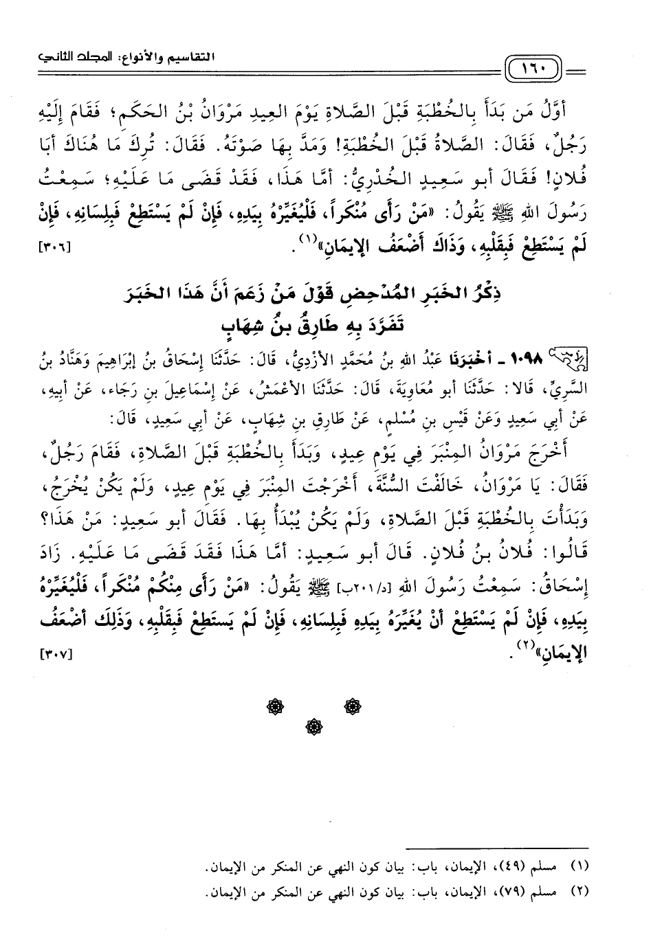 ١٠٩٨ - أَخبَرنا عَبْدُ اللهِ بْنُ مُحَمَّدٍ الأَزْدِيُّ، قَالَ: حَدثنا إِسْحَاقُ بْنُ إِبْرَاهِيمَ، وَهَنَّادُ بْنُ السَّرِيِّ، قَالَا: حَدثنا أَبُو مُعَاوِيَةَ، قَالَ: حَدثنا الأَعْمَشُ، عَنْ إِسْمَاعِيلَ بْنِ رَجَاءٍ، عَنْ أَبِيهِ، عَنْ أَبِي سَعِيدٍ، وَعَنْ قَيْسِ بْنِ مُسْلِمٍ، عَنْ طَارِقِ بْنِ شِهَابٍ، عَنْ أَبِي سَعِيدٍ، قَالَ: أَخْرَجَ مَرْوَانُ الْمِنْبَرَ فِي يَوْمِ عِيدٍ، وَبَدَأَ بِالْخُطْبَةِ قَبْلَ الصَّلَاةِ، فَقَامَ رَجُلٌ، فَقَالَ: يَا مَرْوَانُ، خَالَفْتَ السُّنَّةَ، أَخْرَجْتَ الْمِنْبَرَ فِي يَوْمِ عِيدٍ، وَلَمْ يَكُنْ يُخْرَجُ، وَبَدَأْتَ بِالْخُطْبَةِ قَبْلَ الصَّلَاةِ، وَلَمْ يَكُنْ يُبْدَأُ بِهَا، فَقَالَ أَبُو سَعِيدٍ: مَنْ هَذَا؟ قَالُوا: فُلَانُ بْنُ فُلَانٍ، قَالَ أَبُو سَعِيدٍ: أَمَّا هَذَا فَقَدْ قَضَى مَا عَلَيْهِ، زَادَ إِسْحَاقُ: سَمِعْتُ رَسُولَ اللهِ صَلى الله عَلَيه وسَلم، يَقُولُ: "مَنْ رَأَى مِنْكُمْ مُنْكَرًا فَلْيُغَيِّرْهُ بِيَدِهِ، فَإِنْ لَمْ يَسْتَطِعْ أَنَّ يُغَيِّرَهُ بِيَدِهِ فَبِلِسَانِهِ، فَإِنْ لَمْ يَسْتَطِعْ فَبِقَلْبِهِ، وَذَلِكَ أَضْعَفُ الإِيمَانِ". [٣٠٧]