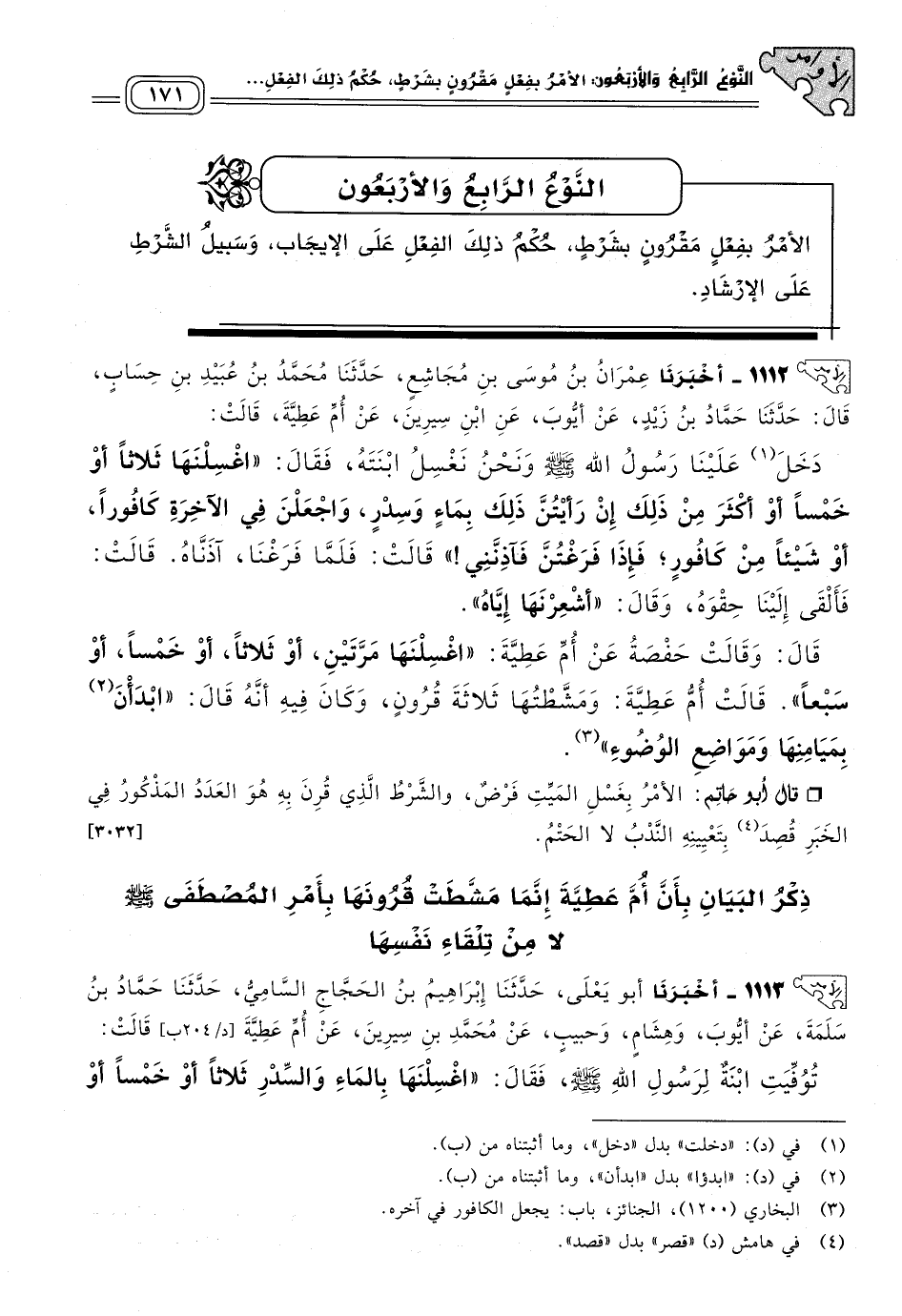 قَالَ أَبُو حَاتِمٍ: الأَمْرُ بِغَسْلِ الْمَيِّتِ فَرْضٌ، وَالشَّرْطُ الَّذِي قُرِنَ بِهِ هُوَ الْعَدَدُ الْمَذْكُورُ فِي الْخَبَرِ قُصِدَ بِتَعْيِينِهِ النَّدْبُ لَا الْحَتْمُ. [٣٠٣٢]