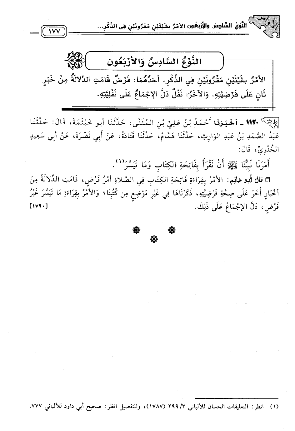 قَالَ أَبُو حَاتِمٍ: الأَمْرُ بِقِرَاءَةِ فَاتِحَةِ الْكِتَابِ فِي الصَّلَاةِ أَمْرُ فَرْضٍ، قَامَتِ الدَّلَالَةُ مِنْ أَخْبَارٍ أُخَرَ عَلَى صِحَّةِ فَرْضِيَّتِهِ، ذَكَرْنَاهَا فِي غَيْرِ مَوْضِعٍ مِنْ كُتُبِنَا وَالأَمْرُ بِقِرَاءَةِ مَا تَيَسَّرَ غَيْرُ فَرْضٍ، دَلَّ الإِجْمَاعُ عَلَى ذَلِكَ. [١٧٩٠]