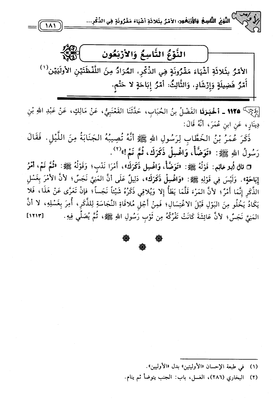 ١١٢٥ - أَخبَرنا الْفَضْلُ بْنُ الْحُبَابِ، حَدثنا الْقَعْنَبِيُّ، عَنْ مَالِكٍ، عَنْ عَبْدِ اللهِ بْنِ دِينَارٍ، عَنِ ابْنِ عُمَرَ، أَنَّهُ قَالَ: ذَكَرَ عُمَرُ بْنُ الْخَطَّابِ لِرَسُولِ اللهِ صَلى الله عَلَيه وسَلم، أَنَّهُ تُصِيبُهُ الْجَنَابَةُ مِنَ اللَّيْلِ، فَقَالَ رَسُولُ اللهِ صَلى الله عَلَيه وسَلم: "تَوَضَّأْ وَاغْسِلْ ذَكَرَكَ، ثُمَّ نَمْ".