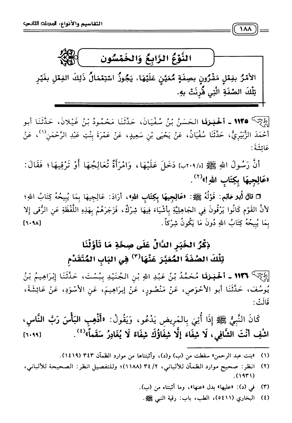 ١١٣٥ - أَخبَرنا الْحَسَنُ بْنُ سُفْيَانَ، حَدثنا مَحْمُودُ بْنُ غَيْلَانَ، حَدثنا أَبُو أَحْمَدَ الزُّبَيْرِيُّ، حَدثنا سُفْيَانُ، عَنْ يَحْيَى بْنِ سَعِيدٍ، عَنْ عَمْرَةَ بنت عبد الرحمن، عَنْ عَائِشَةَ، أَنَّ رَسُولَ اللهِ صَلى الله عَلَيه وسَلم دَخَلَ عَلَيْهَا وَامْرَأَةٌ تُعَالِجُهَا، أَوْ تَرْقِيهَا، فَقَالَ: "عَالِجِيهَا بِكِتَابِ اللهِ".