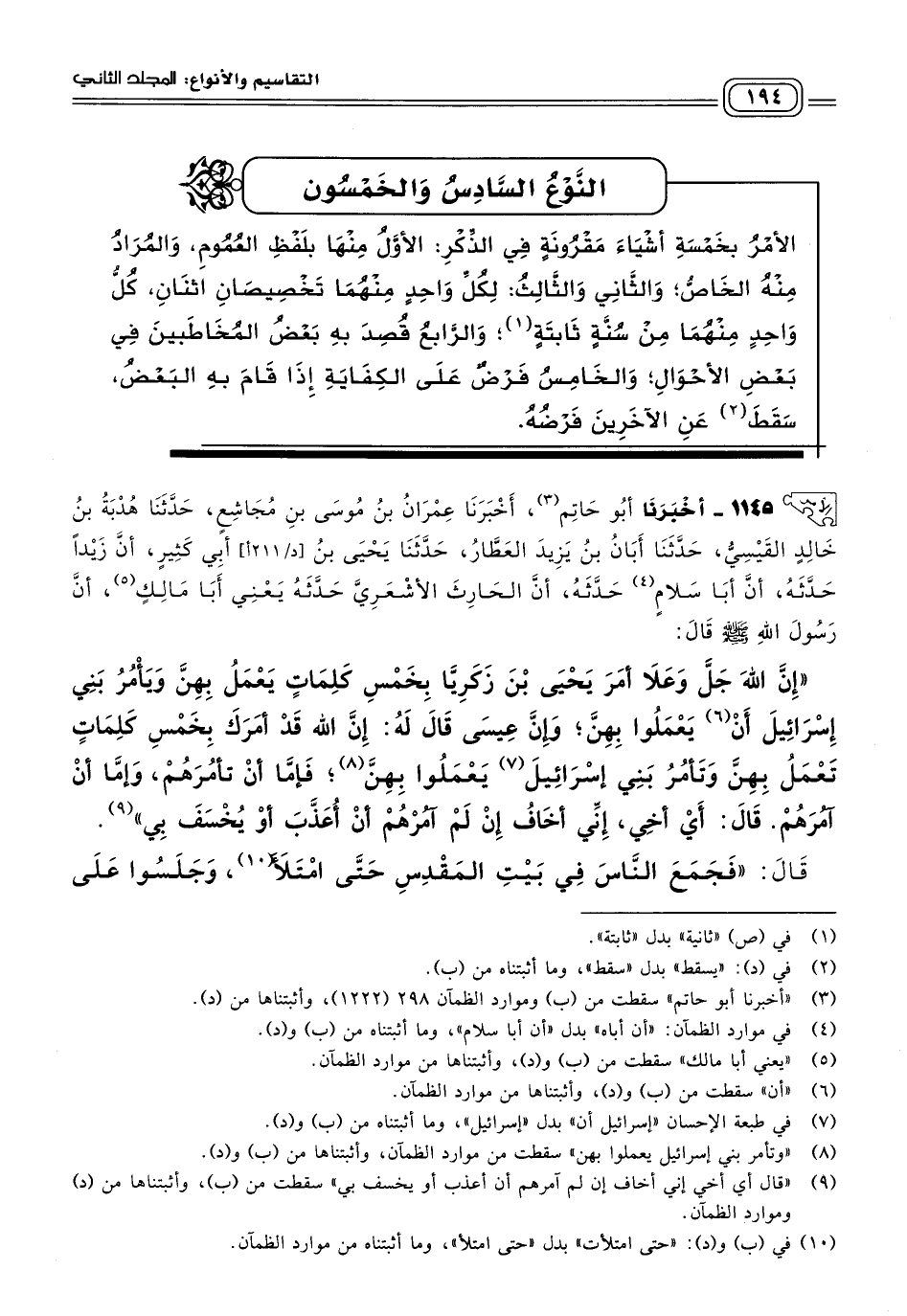 ١١٤٥ - أَخبَرنا أبو حاتم، أخبرنا عِمْرَانُ بْنُ مُوسَى بْنِ مُجَاشِعٍ، حَدثنا هُدْبَةُ بْنُ خَالِدٍ الْقَيْسِيُّ، حَدثنا أَبَانُ بْنُ يَزِيدَ الْعَطَّارُ، حَدثنا يَحْيَى بْنُ أَبِي كَثِيرٍ، أَنَّ زَيْدًا حَدَّثَهُ، أَنَّ أَبَا سَلَاّمٍ حَدَّثَهُ، أَنَّ الْحَارِثَ الأَشْعَرِيَّ حَدَّثَهُ يعني أبا مالك، أَنَّ رَسُولَ اللهِ صَلى الله عَلَيه وسَلم قَالَ: "إِنَّ اللهَ جَلَّ وَعَلَا أَمَرَ يَحْيَى بْنَ زَكَرِيَّا بِخَمْسِ كَلِمَاتٍ يَعْمَلُ بِهِنَّ، وَيَأْمُرُ بَنِي إِسْرَائِيلِ أَنْ يَعْمَلُوا بِهِنَّ، وَإِنَّ عِيسَى قَالَ لَهُ: إِنَّ اللهَ قَدْ أَمَرَكَ بِخَمْسِ كَلِمَاتٍ تَعْمَلُ بِهِنَّ وَتَأْمُرُ بَنِي إِسْرَائِيلَ يَعْمَلُوا بِهِنَّ، فَإِمَّا أَنْ تَأْمُرَهُمْ، وَإِمَّا أَنْ آمُرَهُمْ، (قَالَ: أَيْ أَخِي، إِنِّي أَخَافُ إِنْ لَمْ آمُرْهُمْ أَنْ أُعَذَّبَ، أَوْ يُخْسَفَ بِي) ".