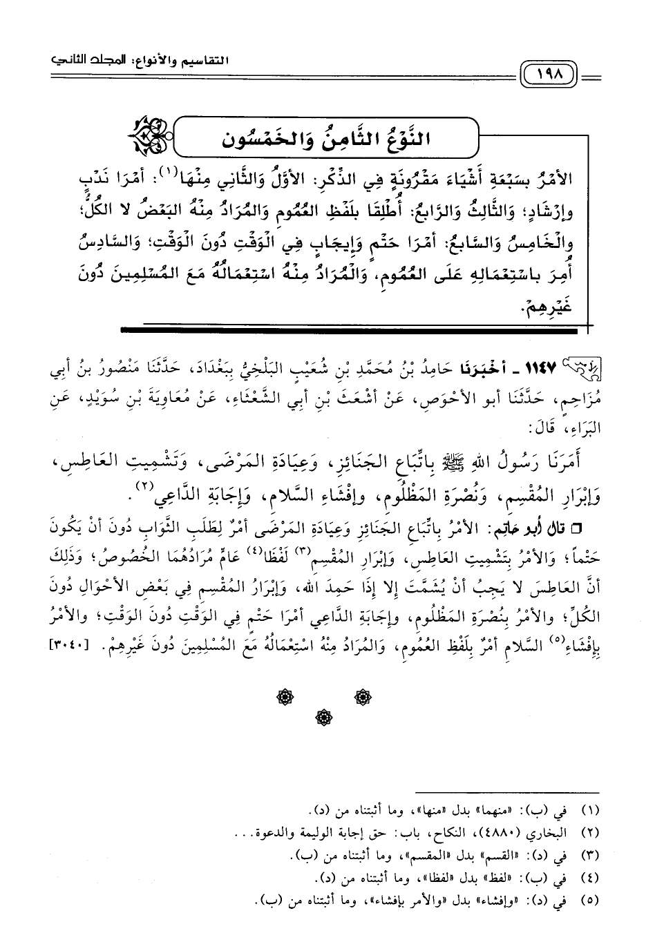 قَالَ أَبُو حَاتِمٍ: الأَمْرُ بِاتِّبَاعِ الْجَنَائِزِ، وَعِيَادَةِ الْمَرْضَى، أَمْرٌ لِطَلَبِ الثَّوَابِ دُونَ أَنْ يَكُونَ حَتْمًا، وَالأَمْرُ بِتَشْمِيتِ الْعَاطِسِ، وَإِبْرَارِ الْمُقْسِمِ، لَفْظا عَام مُرَادُهُمَا الْخُصُوصُ، وَذَلِكَ أَنَّ الْعَاطِسَ لَا يَجِبُ أَنْ يُشَمَّتَ إِلَاّ إِذَا حَمِدَ اللهَ، وَإِبْرَارُ الْمُقْسِمِ فِي بَعْضِ الأَحْوَالِ دُونَ الْكُلِّ، وَالأَمْرُ بِنُصْرَةِ الْمَظْلُومِ، وَإِجَابَةِ الدَّاعِي أَمْرَا حَتْمٍ فِي الْوَقْتِ دُونَ الْوَقْتِ، وَالأَمْرِ بِإِفْشَاءِ السَّلَامِ أَمْرٌ بِلَفْظِ الْعُمُومِ، وَالْمُرَادُ مِنْهُ اسْتِعْمَالُهُ مَعَ الْمُسْلِمِينَ دُونَ غَيْرِهِمْ. [٣٠٤٠]