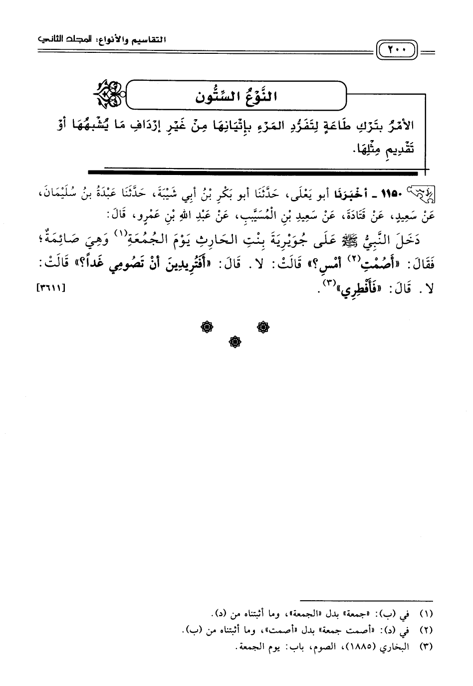 ١١٥٠ - أَخبَرنا أَبُو يَعْلَى، حَدثنا أَبُو بَكْرِ بْنُ أَبِي شَيْبَةَ، حَدثنا عَبْدَةُ بْنُ سُلَيْمَانَ، عَنْ سَعِيدٍ، عَنْ قَتَادَةَ، عَنْ سَعِيدِ بْنِ الْمُسَيَّبِ، عَنْ عَبْدِ اللهِ بْنِ عَمْرٍو، قَالَ: دَخَلَ النَّبِيُّ صَلى الله عَلَيه وسَلم عَلَى جُوَيْرِيَةَ بِنْتِ الْحَارِثِ يَوْمَ الْجُمُعَةِ وَهِيَ صَائِمَةٌ، فَقَالَ: "أَصُمْتِ أَمْسِ؟ " قَالَتْ: لَا، قَالَ: "أَفَتُرِيدِينَ أَنْ تَصُومِي غَدًا؟ " قَالَتْ: لَا، قَالَ: "فَأَفْطِرِي". [٣٦١١]