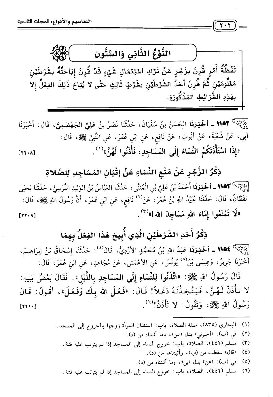 ١١٥٣ - أَخبَرنا أَحْمَدُ بْنُ عَلِيِّ بْنِ الْمُثَنَّى، حَدثنا الْعَبَّاسُ بْنُ الْوَلِيدِ النَّرْسِيُّ، حَدثنا يَحْيَى الْقَطَّانُ، قَالَ: حَدثنا عُبَيْدُ اللهِ بْنُ عُمَرَ، عن نَافِعٍ، عَنِ ابْنِ عُمَرَ، أَنَّ رَسُولَ اللهِ صَلى الله عَلَيه وسَلم قَالَ: "لَا تَمْنَعُوا إِمَاءَ اللهِ مَسَاجِدَ اللهِ". [٢٢٠٩]