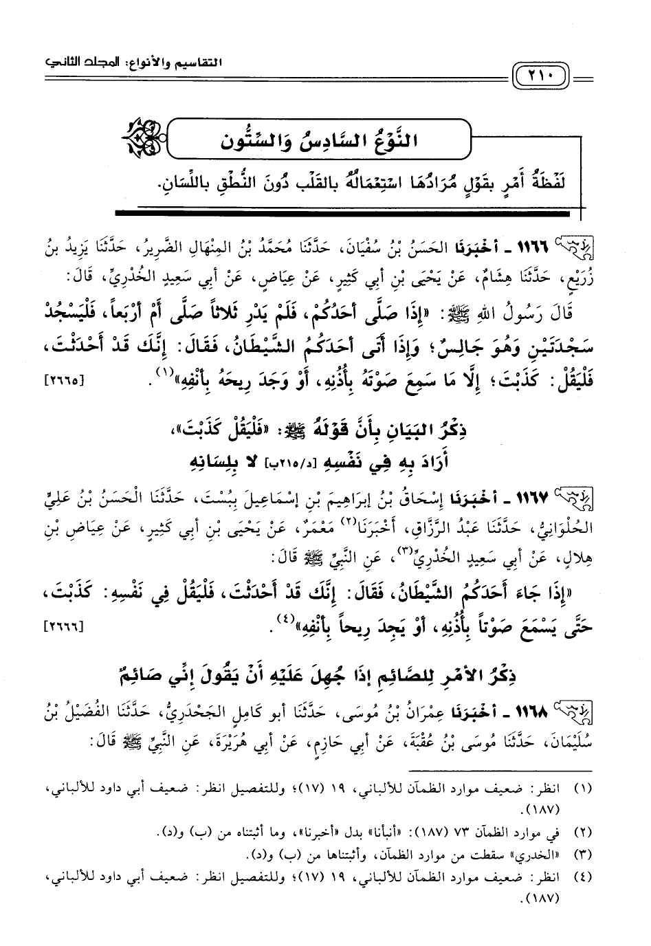 ١١٦٦ - أَخبَرنا الْحَسَنُ بْنُ سُفْيَانَ، حَدثنا مُحَمَّدُ بْنُ الْمِنْهَالِ الضَّرِيرُ، حَدثنا يَزِيدُ بْنُ زُرَيْعٍ، حَدثنا هِشَامٌ، عَنْ يَحْيَى بْنِ أَبِي كَثِيرٍ، عَنْ عِيَاضٍ، عَنْ أَبِي سَعِيدٍ الْخُدْرِيِّ، قَالَ: قَالَ رَسُولُ اللهِ صَلى الله عَلَيه وسَلم: "إِذَا صَلَّى أَحَدُكُمْ، فَلَمْ يَدْرِ ثَلَاثًا صَلَّى أَمْ أَرْبَعًا، فَلْيَسْجُدْ سَجْدَتَيْنِ وَهُوَ جَالِسٌ، وَإِذَا أَتَى أَحَدَكُمُ الشَّيْطَانُ فَقَالَ: إِنَّكَ قَدْ أَحْدَثْتَ، فَلْيَقُلْ: كَذَبْتَ، إِلَاّ مَا سَمِعَ صَوْتَهُ بِأُذُنِهِ، أَوْ وَجَدَ رِيحَهُ بِأَنْفِهِ". [٢٦٦٥]