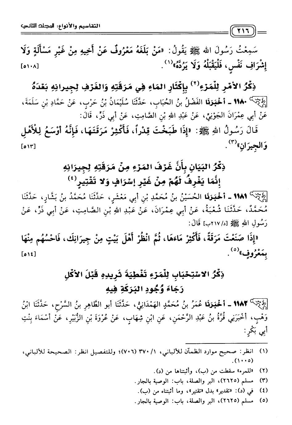 ١١٨٠ - أَخبَرنا الْفَضْلُ بْنُ الْحُبَابِ، حَدثنا سُلَيْمَانُ بْنُ حَرْبٍ، عَنْ حَمَّادِ بْنِ سَلَمَةَ، عَنْ أَبِي عِمْرَانَ الْجَوْنِيِّ، عَنْ عَبْدِ اللهِ بْنِ الصَّامِتِ، عَنْ أَبِي ذَرٍّ، قَالَ: قَالَ رَسُولُ اللهِ صَلى الله عَلَيه وسَلم: "إِذَا طَبَخْتَ قِدْرًا، فَأَكْثِرْ مَرَقَتَهَا، فَإِنَّهُ أَوْسَعُ لِلأَهْلِ وَالْجِيرَانِ". [٥١٣]