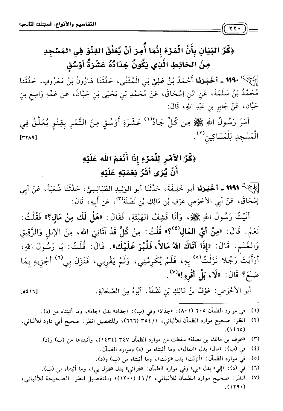 ١١٩١ - أَخبَرنا أَبُو خَلِيفَةَ، حَدثنا أَبُو الْوَلِيدِ الطَّيَالِسِيُّ، حَدثنا شُعْبَةُ، عَنْ أَبِي إِسْحَاقَ، عَنْ أَبِي الأَحْوَصِ عَوْفِ بْنِ مَالِكِ بْنِ نَضْلَةَ، عَنْ أَبِيهِ، قَالَ: أَتَيْتُ رَسُولَ اللهِ صَلى الله عَلَيه وسَلم وَأَنَا قَشِفُ الْهَيْئَةِ، فَقَالَ: "هَلْ لَكَ مِنْ مَالٍ؟ " فَقُلْتُ: نَعَمْ، قَالَ: "مِنْ أَيِّ المَالِ؟ " قُلْتُ: مِنْ كُلٍّ قَدْ آتَانِيَ اللهُ، مِنَ الإِبِلِ وَالرَّقِيقِ وَالْغَنَمِ، قَالَ: "إِذَا آتَاكَ اللهُ مَالاً فَلْيُرَ عَلَيْكَ"، قَالَ: قُلْتُ: يَا رَسُولَ اللهِ، أَرَأَيْتَ رَجُلاً نَزَلْتُ بِهِ فَلَمْ يُكْرِمْنِي، وَلَمْ يَقْرِنِي، فَنَزَلَ بِي أَجْزِيهِ بِمَا صَنَعَ؟ قَالَ: "لَا، بَلْ أَقْرِهِ".