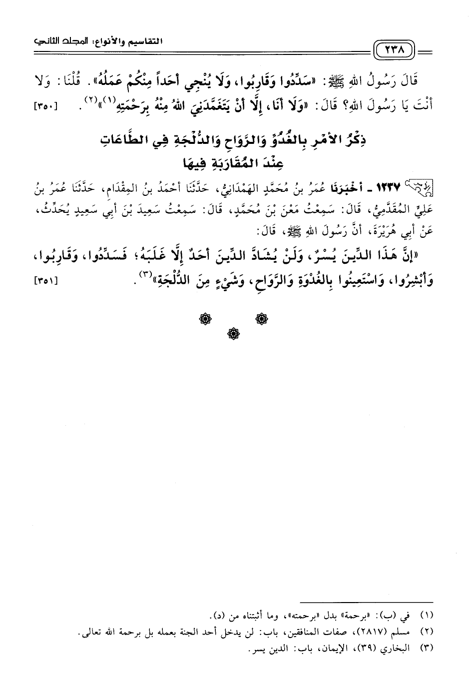 ١٢٣٧ - أَخبَرنا عُمَرُ بْنُ مُحَمَّدٍ الْهَمْدَانِيُّ، حَدثنا أَحْمَدُ بْنُ الْمِقْدَامِ، حَدثنا عُمَرُ بْنُ عَلِيٍّ الْمُقَدَّمِيُّ، قَالَ: سَمِعْتُ مَعْنَ بْنَ مُحَمَّدٍ، قَالَ: سَمِعْتُ سَعِيدَ بْنَ أَبِي سَعِيدٍ يُحَدِّثُ، عَنْ أَبِي هُرَيْرَةَ؛ أَنَّ رَسُولَ اللهِ صَلى الله عَلَيه وسَلم، قَالَ: "إِنَّ هَذَا الدِّينَ يُسْرٌ وَلَنْ يُشَادَّ الدِّينَ أَحَدٌ إِلَاّ غَلَبَهُ، فَسَدِّدُوا وَقَارِبُوا وَأَبْشِرُوا وَاسْتَعِينُوا بِالْغُدْوَةِ وَالرَّوَاحِ وَشَيْءٍ مِنَ الدُّلْجَةِ". [٣٥١]