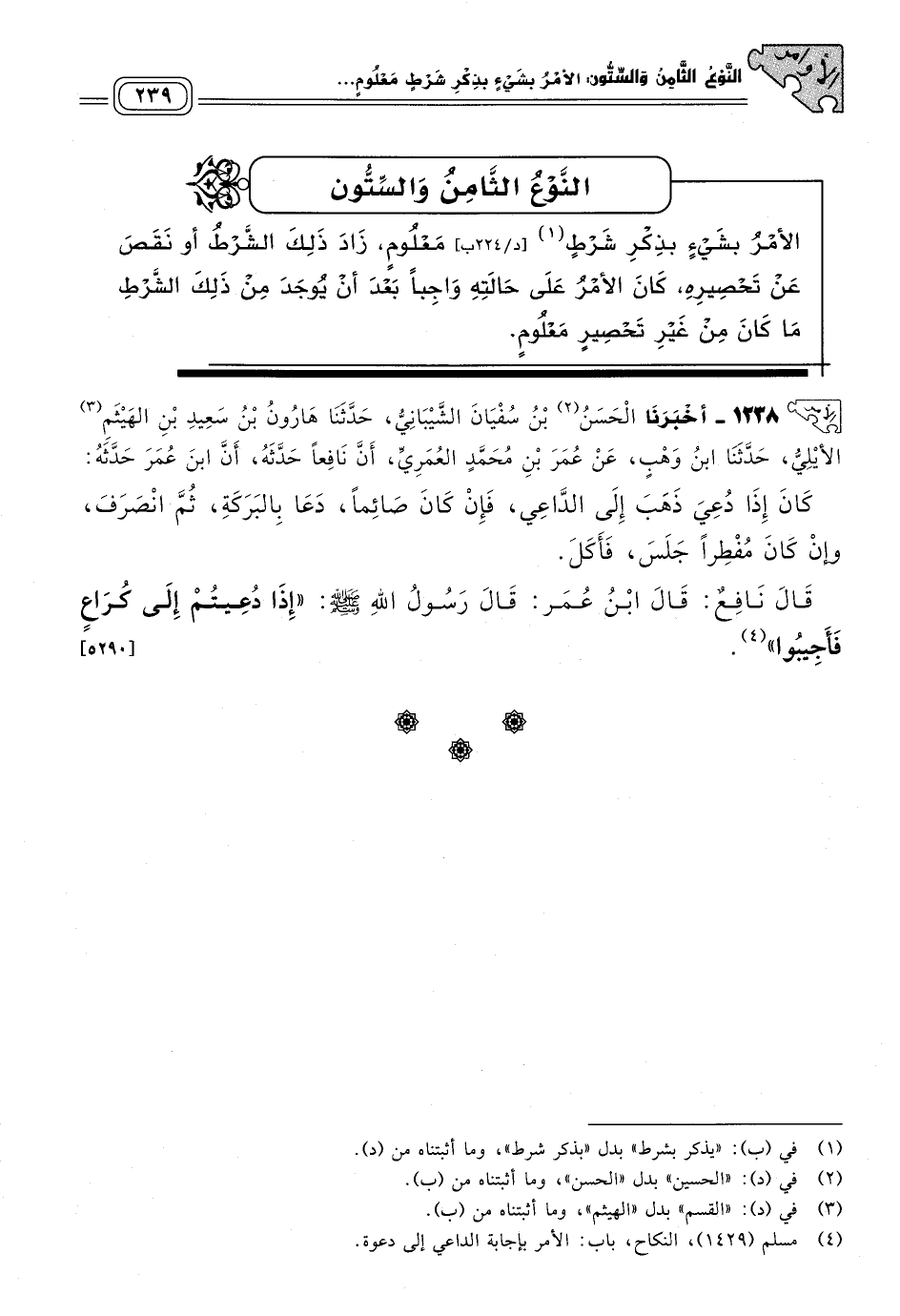 ١٢٣٨ - أَخبَرنا الْحَسَنُ بْنُ سُفْيَانَ الشَّيْبَانِيُّ، حَدثنا هَارُونُ بْنُ سَعِيدِ بْنِ الْهَيْثَمِ الأَيْلِيُّ، حَدثنا ابْنُ وَهْبٍ، عَنْ عُمَرَ بْنِ مُحَمَّدٍ الْعُمَرِيِّ، أَنَّ نَافِعًا حَدَّثَهُ، أَنَّ ابْنَ عُمَرَ حَدَّثَهُ: كَانَ إِذَا دُعِيَ ذَهَبَ إِلَى الدَّاعِي، فَإِنْ كَانَ صَائِمًا دَعَا بِالْبَرَكَةِ ثُمَّ انْصَرَفَ، وَإِنْ كَانَ مُفْطِرًا جَلَسَ فَأَكَلَ.