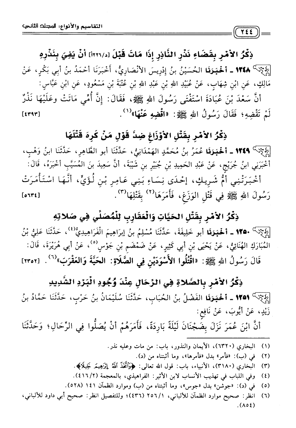 ١٢٥٠ - أَخبَرنا أَبُو خَلِيفَةَ، حَدثنا مُسْلِمُ بْنُ إِبْرَاهِيمَ الْفَرَاهِيدِيُّ، حَدثنا عَلِيُّ بْنُ الْمُبَارَكِ الْهُنَائِيُّ، عَنْ يَحْيَى بْنِ أَبِي كَثِيرٍ، عَنْ ضَمْضَمِ بْنِ جَوْسٍ، عَنْ أَبِي هُرَيْرَةَ، قَالَ: قَالَ رَسُولُ اللهِ صَلى الله عَلَيه وسَلم: "اقْتُلُوا الأَسْوَدَيْنِ فِي الصَّلَاةِ: الْحَيَّةَ وَالْعَقْرَبَ". [٢٣٥٢]
