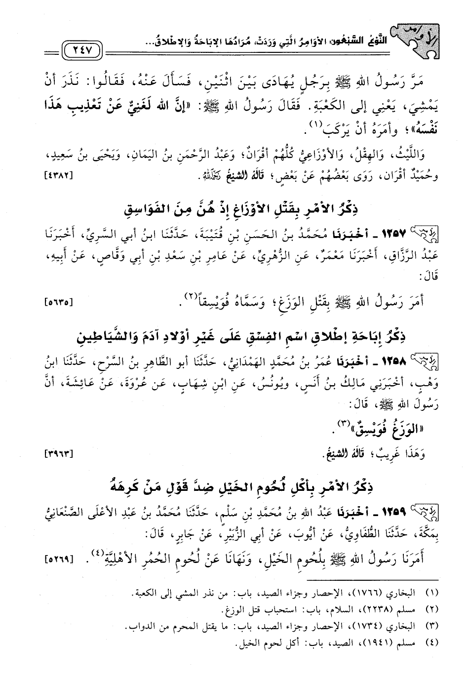 ١٢٥٩ - أَخبَرنا عَبْدُ اللهِ بْنُ مُحَمَّدِ بْنِ سَلْمٍ، حَدثنا مُحَمَّدُ بْنُ عَبْدِ الأَعْلَى الصَّنْعَانِيُّ، بِمَكَّةَ، حَدثنا الطُّفَاوِيُّ، عَنْ أَيُّوبَ، عَنْ أَبِي الزُّبَيْرِ، عَنْ جَابِرٍ، قَالَ: أَمَرَنَا رَسُولُ اللهِ صَلى الله عَلَيه وسَلم بِلُحُومِ الْخَيْلِ، وَنَهَانَا عَنْ لُحُومِ الْحُمُرِ الأَهْلِيَّةِ. [٥٢٦٩]