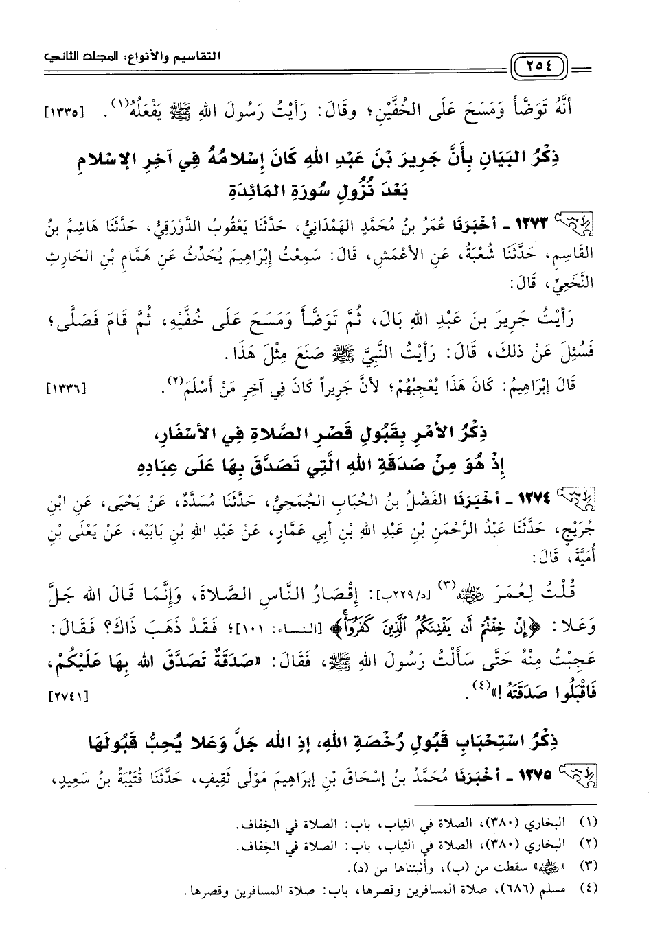 ١٢٧٣ - أَخبَرنا عُمَرُ بْنُ مُحَمَّدٍ الْهَمْدَانِيُّ، حَدثنا يَعْقُوبُ الدَّوْرَقِيُّ، حَدثنا هَاشِمُ بْنُ الْقَاسِمِ، حَدثنا شُعْبَةُ، عَنِ الأَعْمَشِ، قَالَ: سَمِعْتُ إِبْرَاهِيمَ، يُحَدِّثُ، عَنْ هَمَّامِ بْنِ الْحَارِثِ النَّخَعِيِّ، قَالَ: رَأَيْتُ جَرِيرَ بْنَ عَبْدِ اللهِ بَالَ، ثُمَّ تَوَضَّأَ وَمَسَحَ عَلَى خُفَّيْهِ، ثُمَّ قَامَ فَصَلَّى، فَسُئِلَ عَنْ ذَلِكَ، قَالَ: رَأَيْتُ النَّبِيَّ صَلى الله عَلَيه وسَلم صَنَعَ مِثْلَ هَذَا.