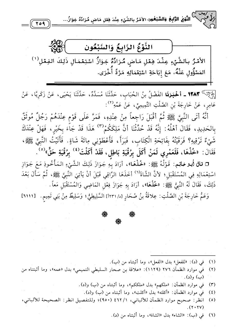 قَالَ أَبُو حَاتِمٍ: قَوْلُهُ صَلى الله عَلَيه وسَلم: "خُذْهَا"، أَرَادَ بِهِ جَوَازَ ذَلِكَ الشَّيْءِ الْمَأْخُوذِ مَعَ جَوَازِ اسْتِعْمَالِهِ فِي الْمُسْتَقْبَلِ، لأَنَّ الشَّاةَ أَخَذَهَا الرَّاقِي قَبْلَ أَنْ يَأْتِيَ النَّبِيُّ صَلى الله عَلَيه وسَلم، ثُمَّ سَأَلَ بَعْدَ ذَلِكَ، فَقَالَ لَهُ النَّبِيُّ صَلى الله عَلَيه وسَلم: "خُذْهَا" أَرَادَ بِهِ جَوَازَ فِعْلِ الْمَاضِي وَالْمُسْتَقْبَلِ مَعًا.