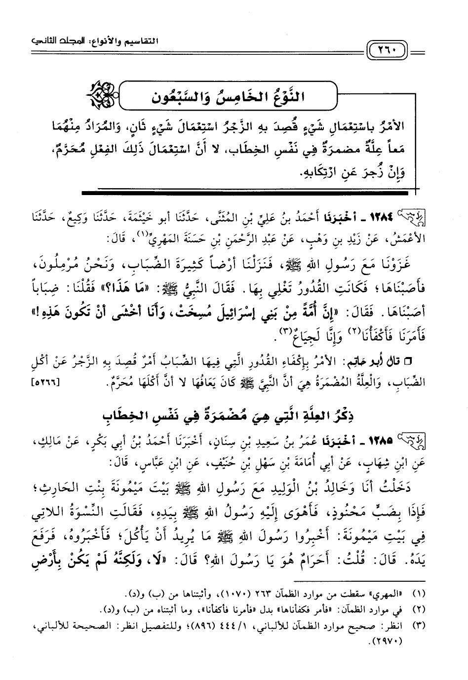 ١٢٨٥ - أَخبَرنا عُمَرُ بْنُ سَعِيدِ بْنِ سِنَانٍ، أَخبَرنا أَحْمَدُ بْنُ أَبِي بَكْرٍ، عَنْ مَالِكٍ، عَنِ ابْنِ شِهَابٍ، عَنْ أَبِي أُمَامَةَ بْنِ سَهْلِ بْنِ حُنَيْفٍ، عَنِ ابْنِ عَبَّاسٍ، قَالَ: دَخَلْتُ أَنَا وَخَالِدُ بْنُ الْوَلِيدِ مَعَ رَسُولِ اللهِ صَلى الله عَلَيه وسَلم بَيْتَ مَيْمُونَةَ بِنْتِ الْحَارِثِ، فَإِذَا بِضَبٍّ مَحْنُوذٍ، فَأَهْوَى إِلَيْهِ رَسُولُ اللهِ صَلى الله عَلَيه وسَلم بِيَدِهِ، فَقَالَتِ النِّسْوَةُ اللَاّتِي فِي بَيْتِ مَيْمُونَةَ: أَخْبِرُوا رَسُولَ اللهِ صَلى الله عَلَيه وسَلم مَا يُرِيدُ أَنْ يَأْكُلَ، فَأَخْبَرُوهُ، فَرَفَعَ يَدَهُ، قَالَ: قُلْتُ: أَحَرَامٌ هُوَ يَا رَسُولَ اللهِ؟ قَالَ: "لَا، وَلَكِنَّهُ لَمْ يَكُنْ بِأَرْضِ قَوْمِي فَأَجِدُنِي أَعَافُهُ". قَالَ خَالِدٌ: فَاجْتَرَرْتُهُ فأكلته، وَرَسُولُ اللهِ صَلى الله عَلَيه وسَلم يَنْظُرُ. [٥٢٦٧]