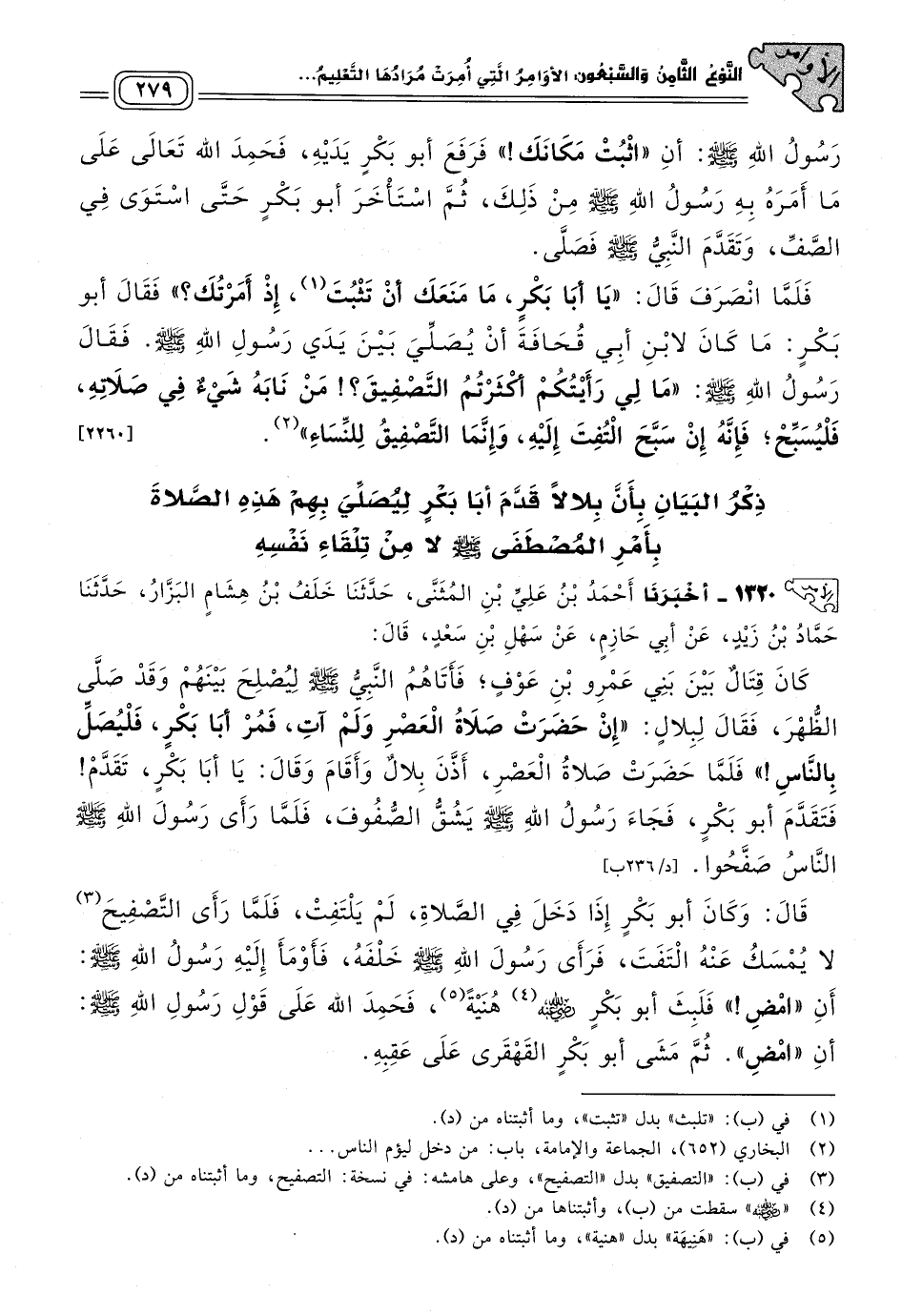 ١٣٢٠ - أَخبَرنا أَحْمَدُ بْنُ عَلِيِّ بْنِ الْمُثَنَّى، حَدثنا خَلَفُ بْنُ هِشَامٍ الْبَزَّارُ، حَدثنا حَمَّادُ بْنُ زَيْدٍ، عَنْ أَبِي حَازِمٍ، عَنْ سَهْلِ بْنِ سَعْدٍ، قَالَ: كَانَ قِتَالٌ بَيْنَ بَنِي عَمْرِو بْنِ عَوْفٍ، فَأَتَاهُمُ النَّبِيُّ صَلى الله عَلَيه وسَلم لِيُصْلِحَ بَيْنَهُمْ، وَقَدْ صَلَّى الظُّهْرَ، فَقَالَ لِبِلَالٍ: "إِنْ حَضَرَتْ صَلَاةُ الْعَصْرِ وَلَمْ آتِ، فَمُرْ أَبَا بَكْرٍ فَلْيُصَلِّ بِالنَّاسِ"، فَلَمَّا حَضَرَتْ صَلَاةُ الْعَصْرِ، أَذَّنَ بِلَالٌ وَأَقَامَ، وَقَالَ: يَا أَبَا بَكْرٍ تَقَدَّمْ، فَتَقَدَّمَ أَبُو بَكْرٍ، فَجَاءَ رَسُولُ اللهِ صَلى الله عَلَيه وسَلم يَشُقُّ الصُّفُوفَ، فَلَمَّا رَأَى رَسُولَ اللهِ صَلى الله عَلَيه وسَلم النَّاسُ صَفَّحُوا. قَالَ: وَكَانَ أَبُو بَكْرٍ إِذَا دَخَلَ فِي الصَّلَاةِ لَمْ يَلْتَفِتْ، فَلَمَّا رَأَى التَّصْفِيحَ لَا يُمْسَكُ عَنْهُ الْتَفَتَ، فَرَأَى رَسُولَ اللهِ صَلى الله عَلَيه وسَلم خَلْفَهُ، فَأَوْمَأَ إِلَيْهِ رَسُولُ اللهِ صَلى الله عَلَيه وسَلم: أَنِ "امْضِ"، فَلَبِثَ أَبُو بَكْرٍ رَضِيَ اللهُ عَنْهُ هُنَيَّةً، فَحَمِدَ اللهَ عَلَى قَوْلِ رَسُولِ اللهِ صَلى الله عَلَيه وسَلم: أَنِ "امْضِ"، ثُمَّ مَشَى أَبُو بَكْرٍ الْقَهْقَرَى عَلَى عَقِبِهِ، فَلَمَّا رَأَى ذَلِكَ النَّبِيُّ صَلى الله عَلَيه وسَلم تَقَدَّمَ فَصَلَّى بِالْقَوْمِ صَلَاتَهُمْ، فَلَمَّا قَضَى صَلَاتَهُ، قَالَ: "يَا أَبَا بَكْرٍ، مَا مَنَعَكَ إِذْ أَوْمَأْتُ إِلَيْكَ أَنْ لَا تَكُونَ مَضَيْتَ؟ " قَالَ أَبُو بَكْرٍ: لَمْ يَكُنْ لاِبْنِ أَبِي قُحَافَةَ أَنْ يَؤُمَّ رَسُولَ اللهِ صَلى الله عَلَيه وسَلم، ثُمَّ قَالَ لِلنَّاسِ: "إِذَا نَابَكُمْ فِي صَلَاتِكُمْ شَيْءٌ، فَلْيُسَبِّحِ الرِّجَالُ، وَلْتُصَفِّقِ النِّسَاءُ". [٢٢٦١]