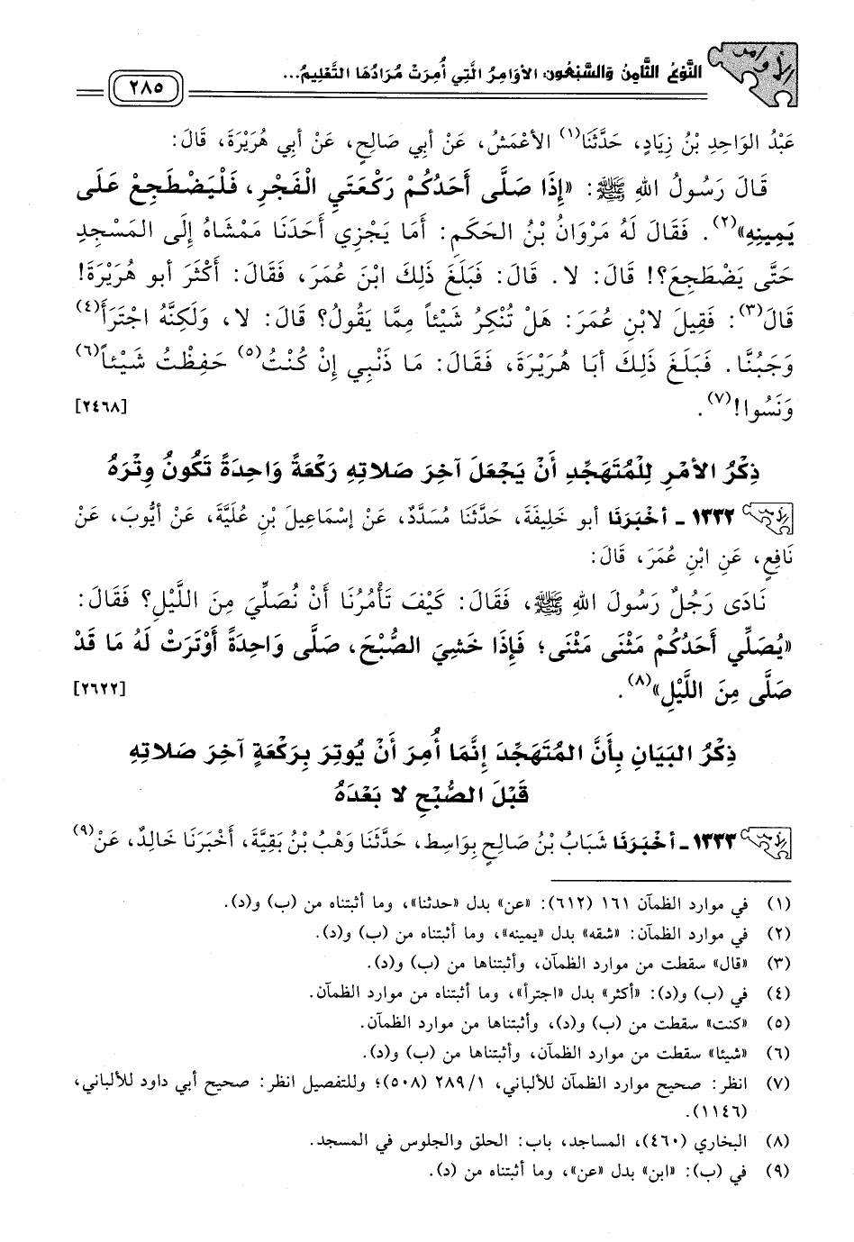 ١٣٣٣ - أَخبَرنا شَبَابُ بْنُ صَالِحٍ بِوَاسِطَ، حَدثنا وَهْبُ بْنُ بَقِيَّةَ، أَخبَرنا خَالِدٌ، عَنْ خَالِدٍ، عَنْ عَبْدِ اللهِ بْنِ شَقِيقٍ، عَنِ ابْنِ عُمَرَ، قَالَ: نَادَى رَجُلٌ رَسُولَ اللهِ صَلى الله عَلَيه وسَلم، وَأَنَا بَيْنَهُمَا، كَيْفَ صَلَاةُ اللَّيْلِ؟ فَقَالَ: "مَثْنَى مَثْنَى، فَإِذَا خَشِيتَ الصُّبْحَ فَصَلِّ وَاحِدَةً وَسَجْدَتَيْنِ قَبْلَ الصُّبْحِ". [٢٦٢٣]
