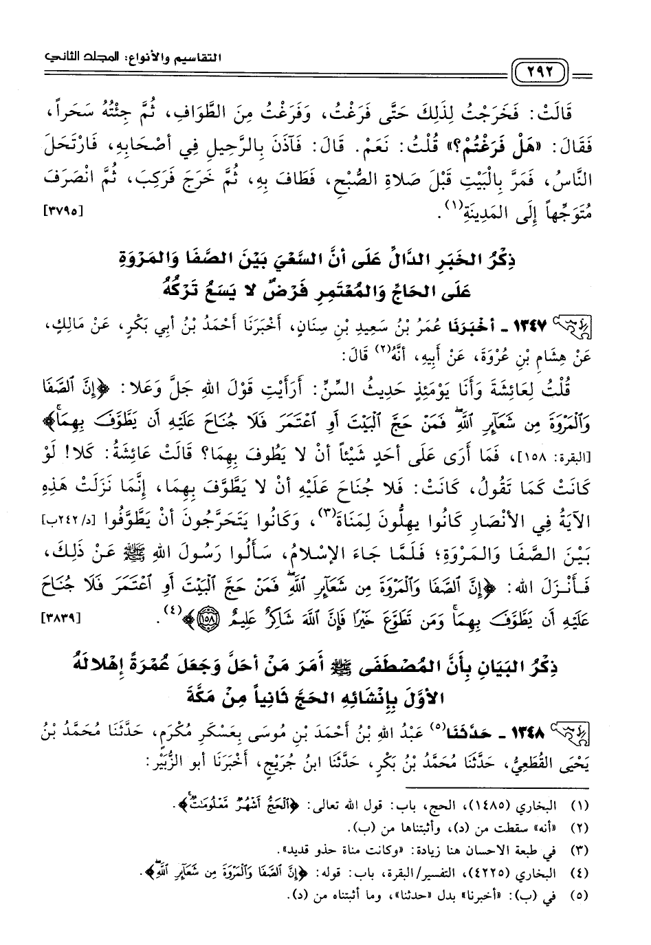١٣٤٧ - أَخبَرنا عُمَرُ بْنُ سَعِيدِ بْنِ سِنَانٍ، أَخبَرنا أَحْمَدُ بْنُ أَبِي بَكْرٍ، عَنْ مَالِكٍ، عَنْ هِشَامِ بْنِ عُرْوَةَ، عَنْ أَبِيهِ، أَنَّهُ قَالَ: قُلْتُ لِعَائِشَةَ وَأَنَا يَوْمَئِذٍ حَدِيثُ السِّنِّ: أَرَأَيْتِ قَوْلَ اللهِ جَلَّ وَعَلَا: {إِنَّ الصَّفَا وَالْمَرْوَةَ مِنْ شَعَائِرِ اللهِ فَمَنْ حَجَّ الْبَيْتَ أَوِ اعْتَمَرَ فَلَا جُنَاحَ عَلَيْهِ أَنْ يَطَّوَّفَ بِهِمَا} [البقرة: ١٥٨] فَمَا أَرَى عَلَى أَحَدٍ شَيْئًا، أَنْ لَا يَطُوفَ بِهِمَا، قَالَتْ عَائِشَةُ: كَلَاّ، لَوْ كَانَتْ كَمَا تَقُولُ، كَانَتْ فَلَا جُنَاحَ عَلَيْهِ أَنْ لَا يَطَّوَّفَ بِهِمَا، إِنَّمَا نَزَلَتْ هَذِهِ الآيَةُ فِي الأَنْصَارِ، كَانُوا يُهِلُّونَ لِمَنَاةَ، وَكَانُوا يَتَحَرَّجُونَ أَنْ يَطَّوَّفُوا بَيْنَ الصَّفَا وَالْمَرْوَةِ، فَلَمَّا جَاءَ الإِسْلَامُ سَأَلُوا رَسُولَ اللهِ صَلى الله عَلَيه وسَلم عَنْ ذَلِكَ، فَأَنْزَلَ اللهُ: {إِنَّ الصَّفَا وَالْمَرْوَةَ مِنْ شَعَائِرِ اللهِ فَمَنْ حَجَّ الْبَيْتَ أَوِ اعْتَمَرَ فَلَا جُنَاحَ عَلَيْهِ أَنْ يَطَّوَّفَ بِهِمَا وَمَنْ تَطَوَّعَ خَيْرًا فَإِنَّ اللهَ شَاكِرٌ عَلِيمٌ}. [٣٨٣٩]