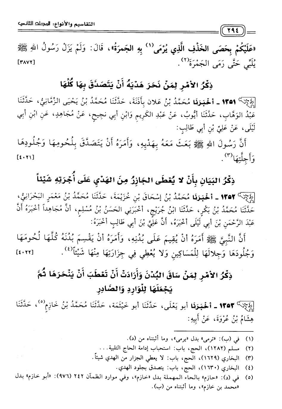 ١٣٥٢ - أَخبَرنا مُحَمَّدُ بْنُ إِسْحَاقَ بْنِ خُزَيْمَةَ، حَدثنا مُحَمَّدُ بْنُ مَعْمَرٍ الْبَحْرَانِيُّ، حَدثنا مُحَمَّدُ بْنُ بَكْرٍ، حَدثنا ابْنُ جُرَيْجٍ، أَخْبَرَنِي الْحَسَنُ بْنُ مُسْلِمٍ، أَنْ مُجَاهِدًا أَخْبَرَهُ، أَنَّ عَبْدَ الرَّحْمَنِ بْنَ أَبِي لَيْلَى أَخْبَرَهُ، أَنَّ عَلِيَّ بْنَ أَبِي طَالِبٍ أَخْبَرَهُ، أَنَّ النَّبِيَّ صَلى الله عَلَيه وسَلم أَمَرَهُ أَنْ يُقِيمَ عَلَى بُدْنِهِ، وَأَمَرَهُ أَنْ يَقْسِمَ بُدْنَهُ كُلَّهَا لُحُومَهَا، وَجُلُودَهَا، وَجِلَالَهَا لِلْمَسَاكِينِ، وَلَا يُعْطِي فِي جِزَارَتِهَا مِنْهَا شَيْئًا. [٤٠٢٢]