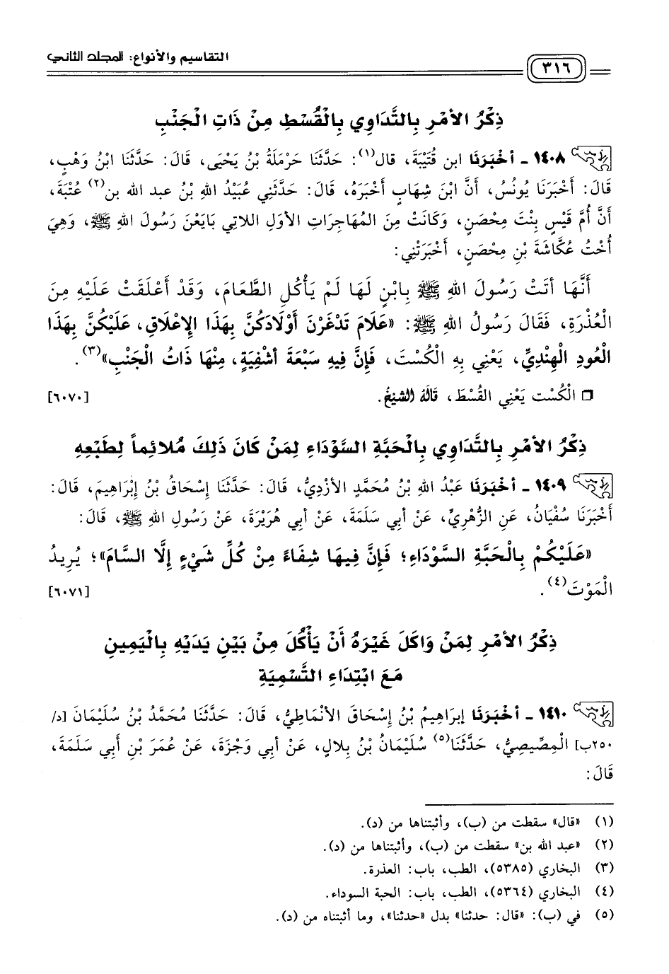 ١٤٠٨ - أَخبَرنا ابْنُ قُتَيْبَةَ، قال: حَدثنا حَرْمَلَةُ بْنُ يَحْيَى، قَالَ: حَدثنا ابْنُ وَهْبٍ، قَالَ: أَخبَرنا يُونُسُ، أَنَّ ابْنَ شِهَابٍ أَخْبَرَهُ قَالَ: حَدَّثَنِي عُبَيْدُ اللهِ بْنُ عبد الله بن عُتْبَةَ، أَنَّ أُمَّ قَيْسٍ بِنْتَ مِحْصَنٍ، وَكَانَتْ مِنَ الْمُهَاجِرَاتِ الأُوَلِ اللَاّتِي بَايَعْنَ رَسُولَ اللهِ صَلى الله عَلَيه وسَلم، وَهِيَ أُخْتُ عُكَّاشَةَ بْنِ مِحْصَنٍ، أَخْبَرَتْنِي أَنَّهَا أَتَتْ رَسُولَ اللهِ صَلى الله عَلَيه وسَلم بِابْنٍ لَهَا لَمْ يَأْكُلِ الطَّعَامَ، وَقَدْ أَعْلَقَتْ عَلَيْهِ مِنَ الْعُذْرَةِ، فَقَالَ رَسُولُ اللهِ صَلى الله عَلَيه وسَلم: "عَلَامَ تَدْغَرْنَ أَوْلَادَكُنَّ بِهَذَا الإِعْلَاقِ، عَلَيْكُنَّ بِهَذَا الْعُودِ الْهِنْدِيِّ، يَعْنِي بِهِ الْكُسْتَ، فَإِنَّ فِيهِ سَبْعَةَ أَشْفِيَةٍ، مِنْهَا ذَاتُ الْجَنْبِ".