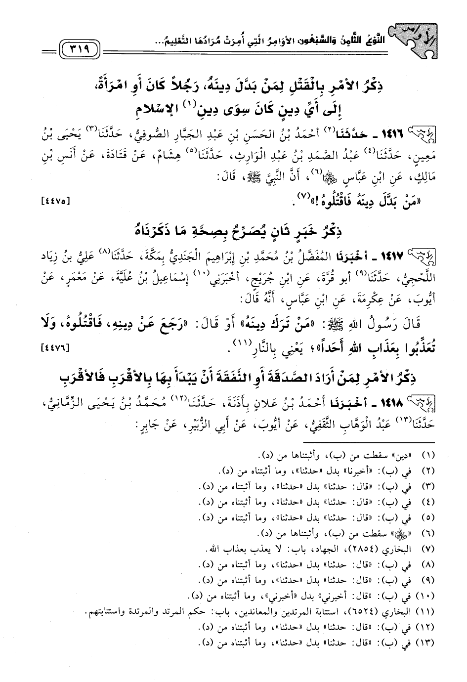 ١٤١٦ - حدثنا أَحْمَدُ بْنُ الْحَسَنِ بْنِ عَبْدِ الْجَبَّارِ الصُّوفِيُّ، حَدثنا يَحْيَى بْنُ مَعِينٍ، حَدثنا عَبْدُ الصَّمَدِ بْنُ عَبْدِ الْوَارِثِ، حَدثنا هِشَامٌ، عَنْ قَتَادَةَ، عَنْ أَنَسِ بْنِ مَالِكٍ، عَنِ ابْنِ عَبَّاسٍ رَضِيَ اللهُ عَنْهُما، أَنَّ النَّبِيَّ صَلى الله عَلَيه وسَلم قَالَ: "مَنْ بَدَّلَ دِينَهُ فَاقْتُلُوهُ". [٤٤٧٥]
