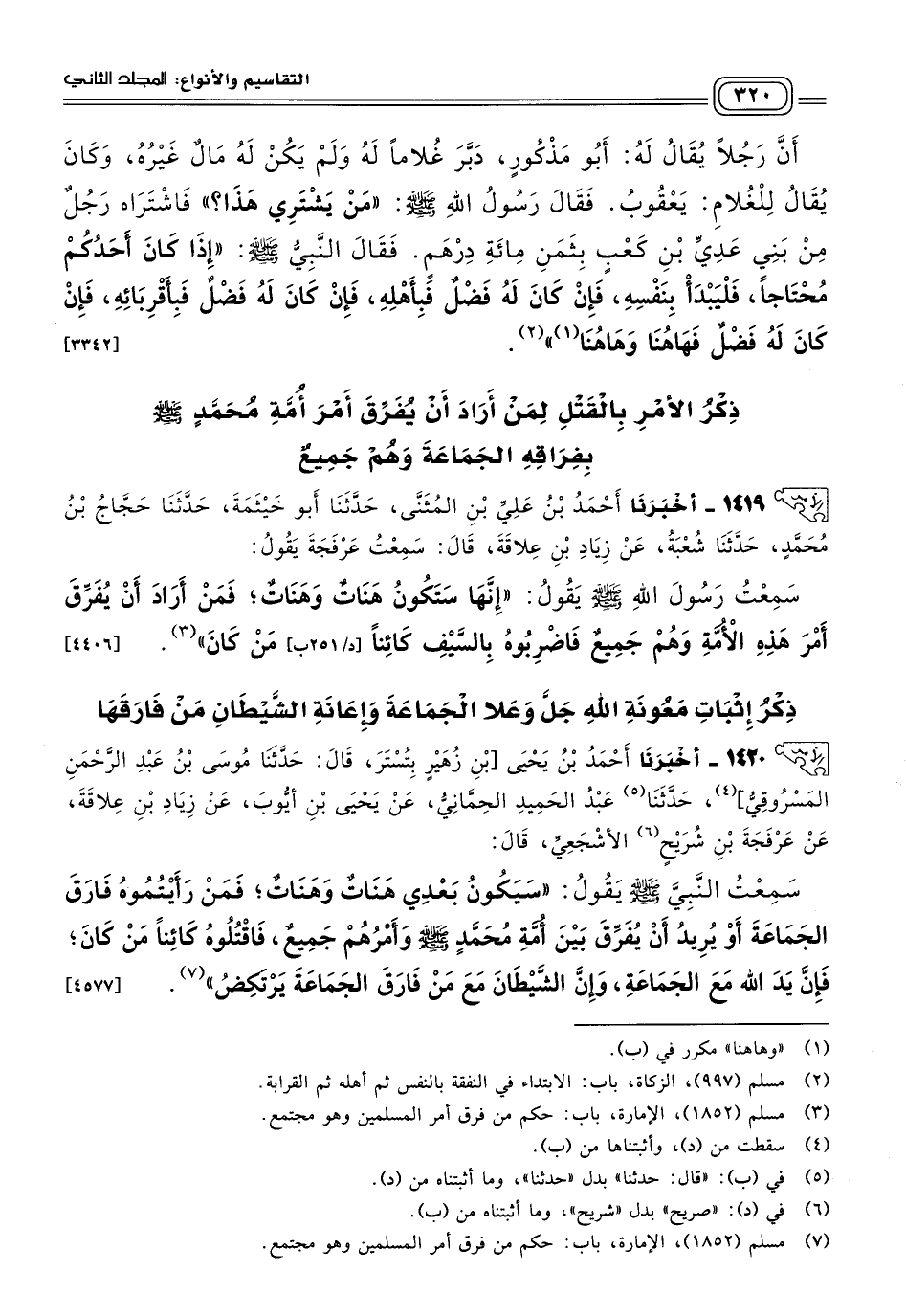 ١٤١٩ - أَخبَرنا أَحْمَدُ بْنُ عَلِيِّ بْنِ الْمُثَنَّى، حَدثنا أَبُو خَيْثَمَةَ، حَدثنا حَجَّاجُ بْنُ مُحَمَّدٍ، حَدثنا شُعْبَةُ، عَنْ زِيَادِ بْنِ عِلَاقَةَ قَالَ: سَمِعْتُ عَرْفَجَةَ يَقُولُ: سَمِعْتُ رَسُولَ اللهِ صَلى الله عَلَيه وسَلم يَقُولُ: "إِنَّهَا سَتَكُونُ هَنَاتٌ وَهَنَاتٌ، فَمَنْ أَرَادَ أَنْ يُفَرِّقَ أَمْرَ هَذِهِ الأُمَّةِ وَهُمْ جَمِيعٌ فَاضْرِبُوهُ بِالسَّيْفِ كَائِنًا مَنْ كَانَ". [٤٤٠٦]