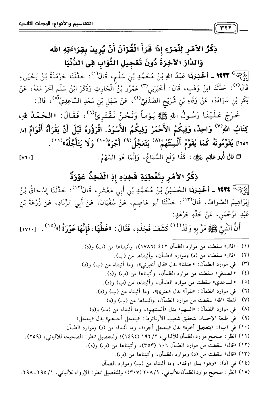 قَالَ أَبُو حَاتِمٍ رَضِيَ اللهُ عَنْهُ: كَذَا وَقَعَ السَّمَاعُ، وَإِنَّمَا هُوَ السَّهْمُ. [٧٦٠]