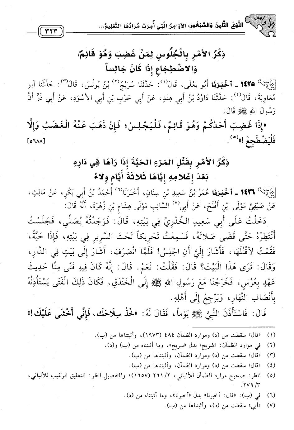 ١٤٢٥ - أَخبَرنا أَبُو يَعْلَى، قَالَ: حَدثنا سُرَيْجُ بْنُ يُونُسَ، قَالَ: حَدثنا أَبُو مُعَاوِيَةَ، قَالَ: حَدثنا دَاوُدُ بْنُ أَبِي هِنْدَ، عَنْ أَبِي حَرْبِ بْنِ أَبِي الأَسْوَدِ، عَنْ أَبِي ذَرٍّ، أَنَّ رَسُولَ اللهِ صَلى الله عَلَيه وسَلم قَالَ: "إِذَا غَضِبَ أَحَدُكُمْ وَهُوَ قَائِمٌ فَلْيَجْلِسْ، فَإِنْ ذَهَبَ عَنْهُ الْغَضَبُ وَإِلَاّ فَلْيَضْطَجِعْ". [٥٦٨٨]