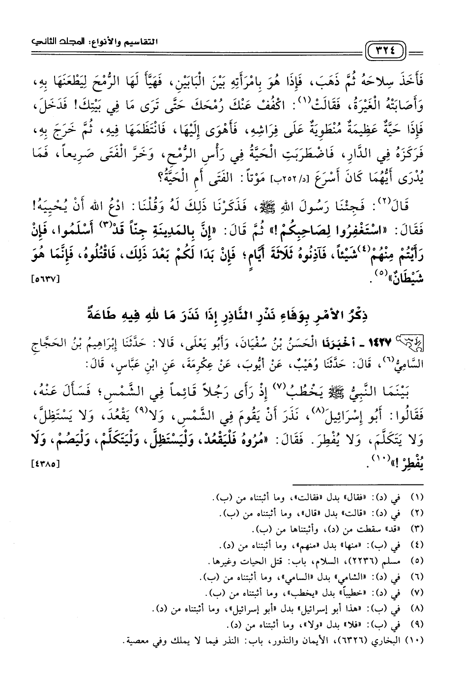 ١٤٢٧ - أَخبَرنا الْحَسَنُ بْنُ سُفْيَانَ، وَأَبُو يَعْلَى، قَالَا: حَدثنا إِبْرَاهِيمُ بْنُ الْحَجَّاجِ السَّامِيُّ، قَالَ: حَدثنا وُهَيْبٌ، عَنْ أَيُّوبَ، عَنْ عِكْرِمَةَ، عَنِ ابْنِ عَبَّاسٍ قَالَ: بَيْنَمَا النَّبِيُّ صَلى الله عَلَيه وسَلم يَخْطُبُ إِذْ رَأَى رَجُلاً قَائِمًا فِي الشَّمْسِ، فَسَأَلَ عَنْهُ، فَقَالُوا: أَبُو إِسْرَائِيلَ، نَذَرَ أَنْ يَقُومَ فِي الشَّمْسِ وَلا يَقْعُدَ، وَلَا يَسْتَظِلَّ، وَلَا يَتَكَلَّمَ، وَلَا يُفْطِرَ، فَقَالَ: "مُرُوهُ فَلْيَقْعُدْ، وَلْيَسْتَظِلَّ، وَلْيَتَكَلَّمْ، وَلْيَصُمْ، وَلا يُفْطِرْ". [٤٣٨٥]