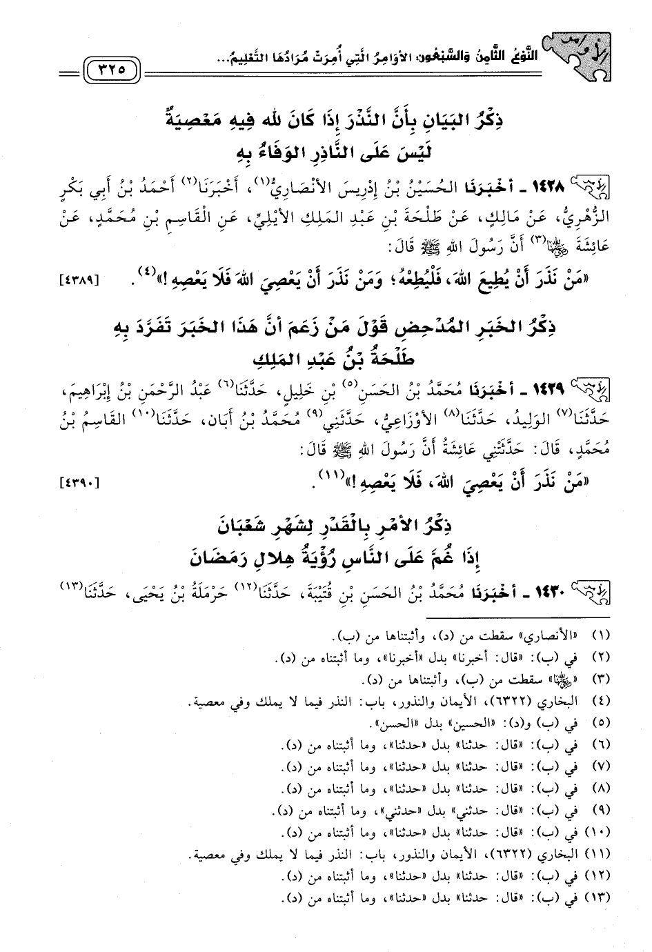 ١٤٢٨ - أَخبَرنا الْحُسَيْنُ بْنُ إِدْرِيسَ الأَنْصَارِيُّ، أَخبَرنا أَحْمَدُ بْنُ أَبِي بَكْرٍ الزُّهْرِيُّ، عَنْ مَالِكٍ، عَنْ طَلْحَةَ بْنِ عَبْدِ الْمَلِكِ الأَيْلِيِّ، عَنِ الْقَاسِمِ بْنِ مُحَمَّدٍ، عَنْ عَائِشَةَ رَضِيَ اللهُ عَنْهَا، أَنَّ رَسُولَ اللهِ صَلى الله عَلَيه وسَلم قَالَ: "مَنْ نَذَرَ أَنْ يُطِيعَ اللهَ فَلْيُطِعْهُ، وَمَنْ نَذَرَ أَنْ يَعْصِيَ اللهَ فَلَا يَعْصِهِ". [٤٣٨٩]