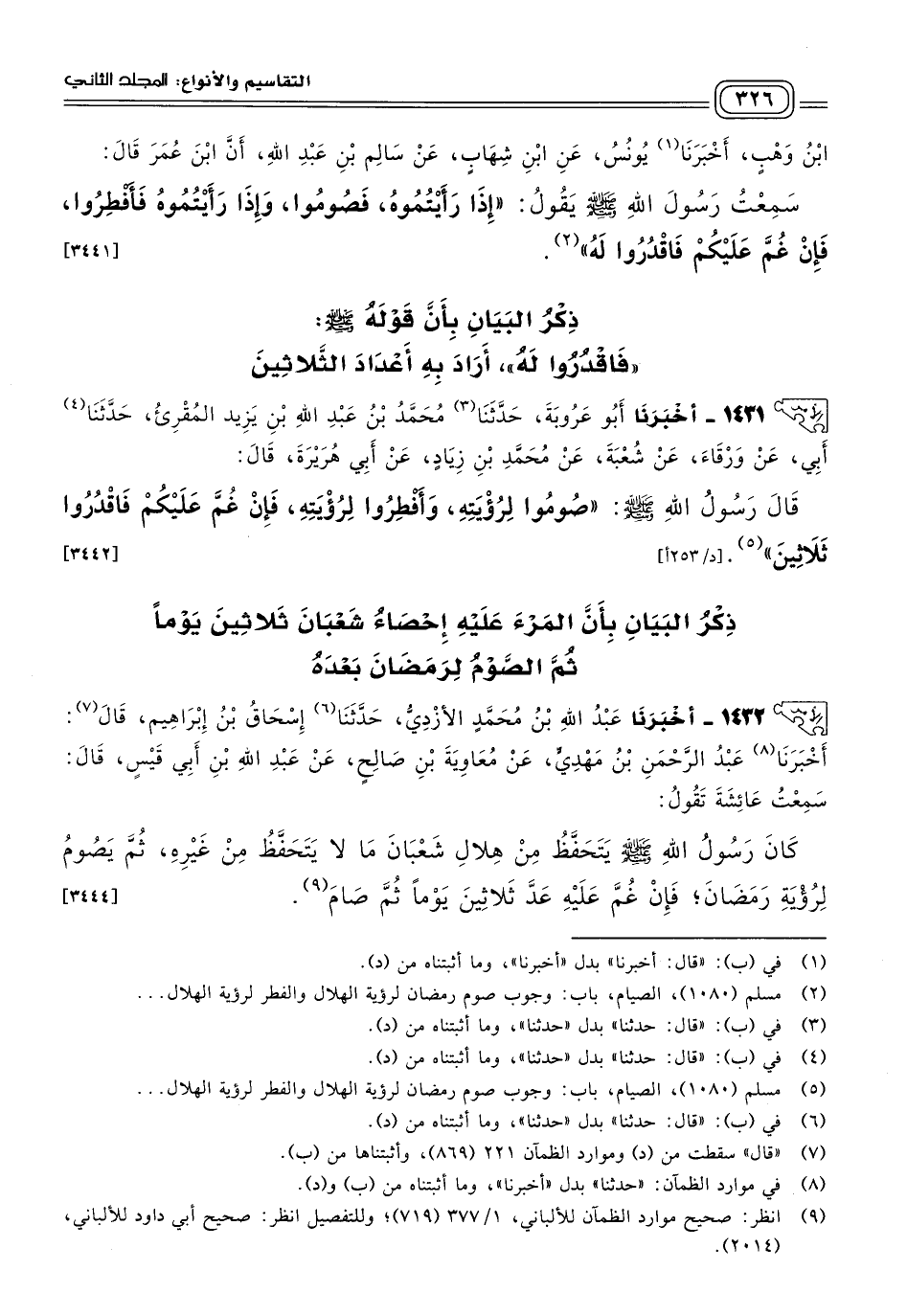 ١٤٣١ - أَخبَرنا أَبُو عَرُوبَةَ، حَدثنا مُحَمَّدُ بْنُ عَبْدِ اللهِ بْنِ يَزِيدٍ الْمُقْرِئُ، حَدثنا أَبِي، عَنْ وَرْقَاءَ، عَنْ شُعْبَةَ، عَنْ مُحَمَّدِ بْنِ زِيَادٍ، عَنْ أَبِي هُرَيْرَةَ، قَالَ: قَالَ رَسُولُ اللهِ صَلى الله عَلَيه وسَلم: "صُومُوا لِرُؤْيَتِهِ، وَأَفْطِرُوا لِرُؤْيَتِهِ، فَإِنْ غُمَّ عَلَيْكُمْ، فَاقْدُرُوا ثَلَاثِينَ". [٣٤٤٢]