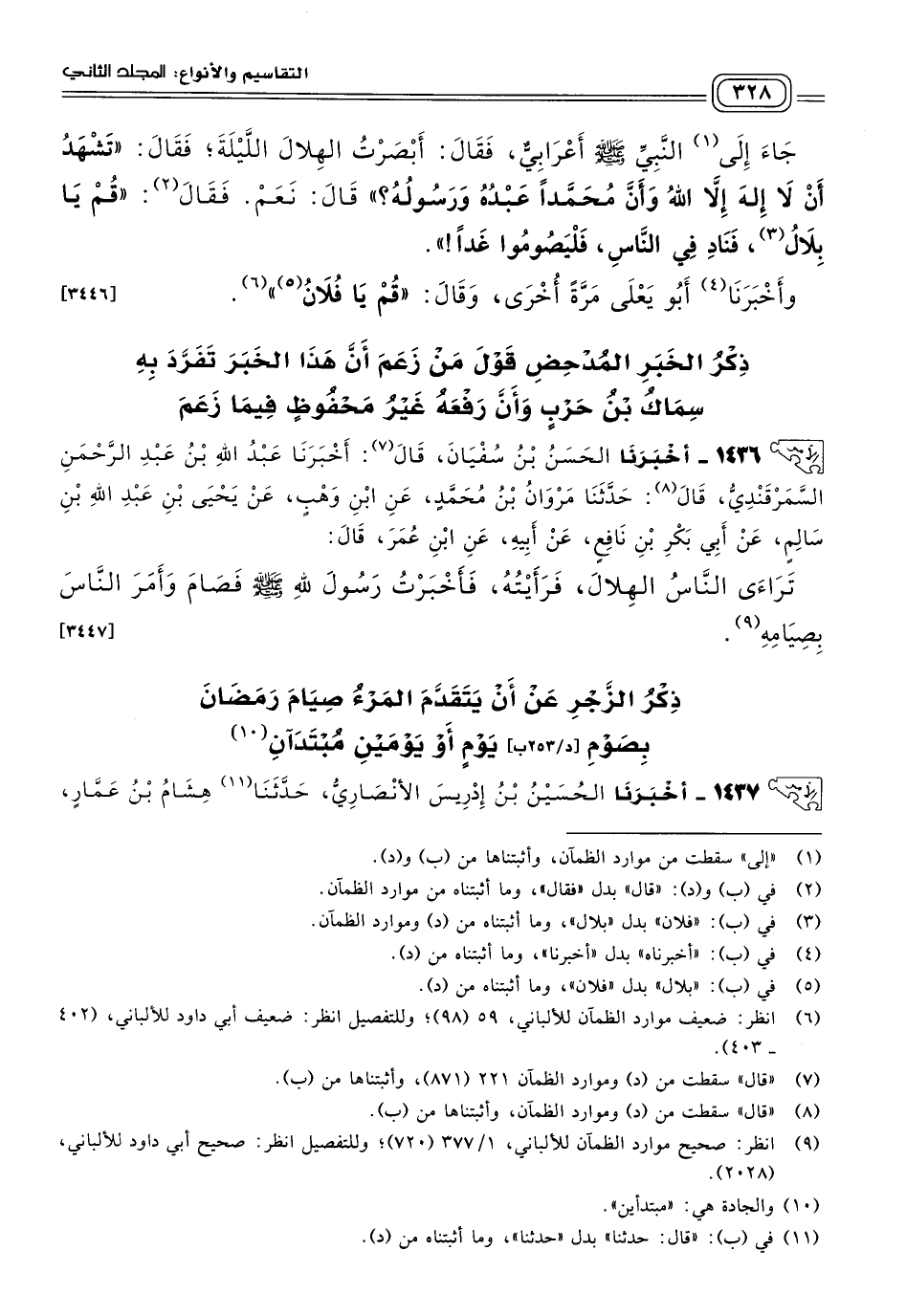 ١٤٣٦ - أَخبَرنا الْحَسَنُ بْنُ سُفْيَانَ، قَالَ: أخبرنا عَبْدُ اللهِ بْنُ عَبْدِ الرَّحْمَنِ السَّمَرْقَنْدِيُّ، قَالَ: حَدثنا مَرْوَانُ بْنُ مُحَمَّدٍ، عَنِ ابْنِ وَهْبٍ، عَنْ يَحْيَى بْنِ عَبْدِ اللهِ بْنِ سَالِمٍ، عَنْ أَبِي بَكْرِ بْنِ نَافِعٍ، عَنْ أَبِيهِ، عَنِ ابْنِ عُمَرَ، قَالَ: تَرَاءَى النَّاسُ الْهِلَالَ، فَرَأَيْتُهُ، فَأَخْبَرْتُ رَسُولَ اللهِ صَلى الله عَلَيه وسَلم فَصَامَ، وَأَمَرَ النَّاسَ بِصِيَامِهِ. [٣٤٤٧]