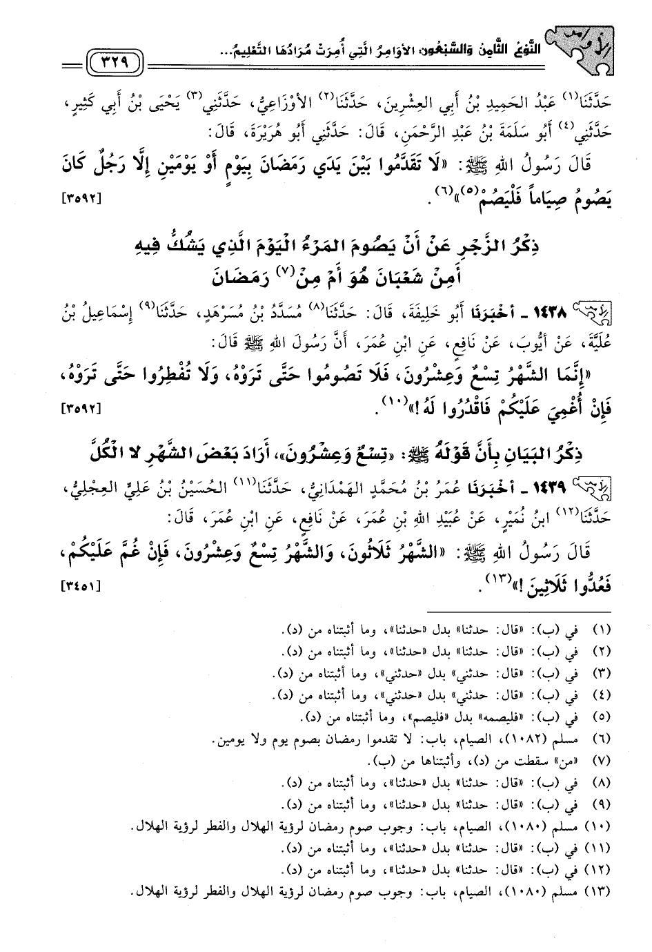 ١٤٣٩ - أَخبَرنا عُمَرُ بْنُ مُحَمَّدٍ الْهَمْدَانِيُّ، حَدثنا الْحُسَيْنُ بْنُ عَلِيٍّ الْعِجْلِيُّ، حَدثنا ابْنُ نُمَيْرٍ، عَنْ عُبَيْدِ اللهِ بْنِ عُمَرَ، عَنْ نَافِعٍ، عَنِ ابْنِ عُمَرَ، قَالَ: قَالَ رَسُولُ اللهِ صَلى الله عَلَيه وسَلم: "الشَّهْرُ ثَلَاثُونَ، وَالشَّهْرُ تِسْعٌ وَعِشْرُونَ، فَإِنْ غُمَّ عَلَيْكُمْ فَعُدُّوا ثَلاثِينَ". [٣٤٥١]