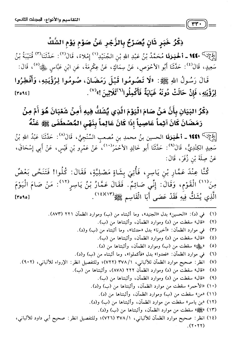 ١٤٤١ - أَخبَرنا الْحُسَيْنُ بْنُ مُحَمَّدِ بْنِ مُصْعَبٍ السِّنْجِيُّ، قَالَ: حَدثنا عَبْدُ اللهِ بْنُ سَعِيدٍ الْكِنْدِيُّ، قَالَ: حَدثنا أَبُو خَالِدٍ الأَحْمَرُ، عَنْ عَمْرِو بْنِ قَيْسٍ، عَنْ أَبِي إِسْحَاقَ، عَنْ صِلَةَ بْنِ زُفَرَ، قَالَ: كُنَّا عِنْدَ عَمَّارِ بْنِ يَاسِرٍ فَأُتِيَ بِشَاةٍ مَصْلِيَّةٍ، فَقَالَ: كُلُوا، فَتَنَحَّى بَعْضٌ من الْقَوْمِ، وَقَالَ: إِنِّي صَائِمٌ، فَقَالَ عَمَّارُ بْنُ يَاسِرٍ: مَنْ صَامَ الْيَوْمَ الَّذِي يُشَكُّ فِيهِ فَقَدْ عَصَى أَبَا الْقَاسِمِ صَلى الله عَلَيه وسَلم. [٣٥٩٥]