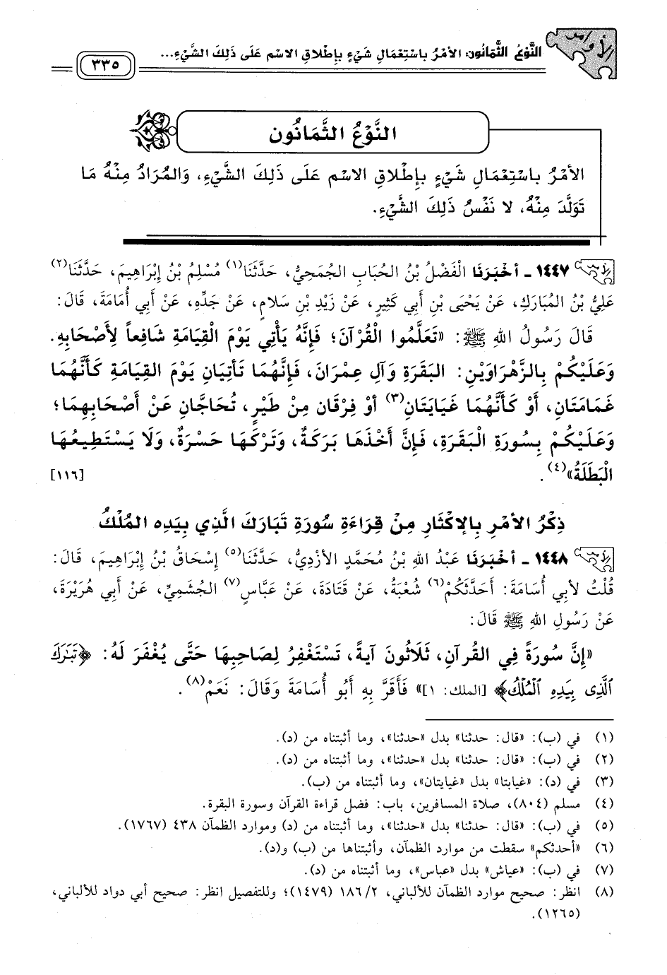 ١٤٤٧ - أَخبَرنا الْفَضْلُ بْنُ الْحُبَابِ الْجُمَحِيُّ، حَدثنا مُسْلِمُ بْنُ إِبْرَاهِيمَ، حَدثنا عَلِيُّ بْنُ الْمُبَارَكِ، عَنْ يَحْيَى بْنِ أَبِي كَثِيرٍ، عَنْ زَيْدِ بْنِ سَلَاّمٍ، عَنْ جَدِّهِ، عَنْ أَبِي أُمَامَةَ، قَالَ: قَالَ رَسُولُ اللهِ صَلى الله عَلَيه وسَلم: "تَعَلَّمُوا الْقُرْآنَ، فَإِنَّهُ يَأْتِي يَوْمَ الْقِيَامَةِ شَافِعًا لأَصْحَابِهِ، وَعَلَيْكُمْ بِالزَّهْرَاوَيْنِ: الْبَقَرَةِ وَآلِ عِمْرَانَ، فَإِنَّهُمَا تَأْتِيَانِ يَوْمَ الْقِيَامَةِ كَأَنَّهُمَا غَمَامَتَانِ، أَوْ كَأَنَّهُمَا غَيَايَتَانِ، أَوْ فِرْقَانِ مِنْ طَيْرٍ تُحَاجَّانِ عَنْ أَصْحَابِهِمَا، وَعَلَيْكُمْ بِسُورَةِ الْبَقَرَةِ، فَإِنَّ أَخْذَهَا بَرَكَةٌ، وَتَرْكَهَا حَسْرَةٌ، وَلَا يَسْتَطِيعُهَا الْبَطَلَةُ". [١١٦]