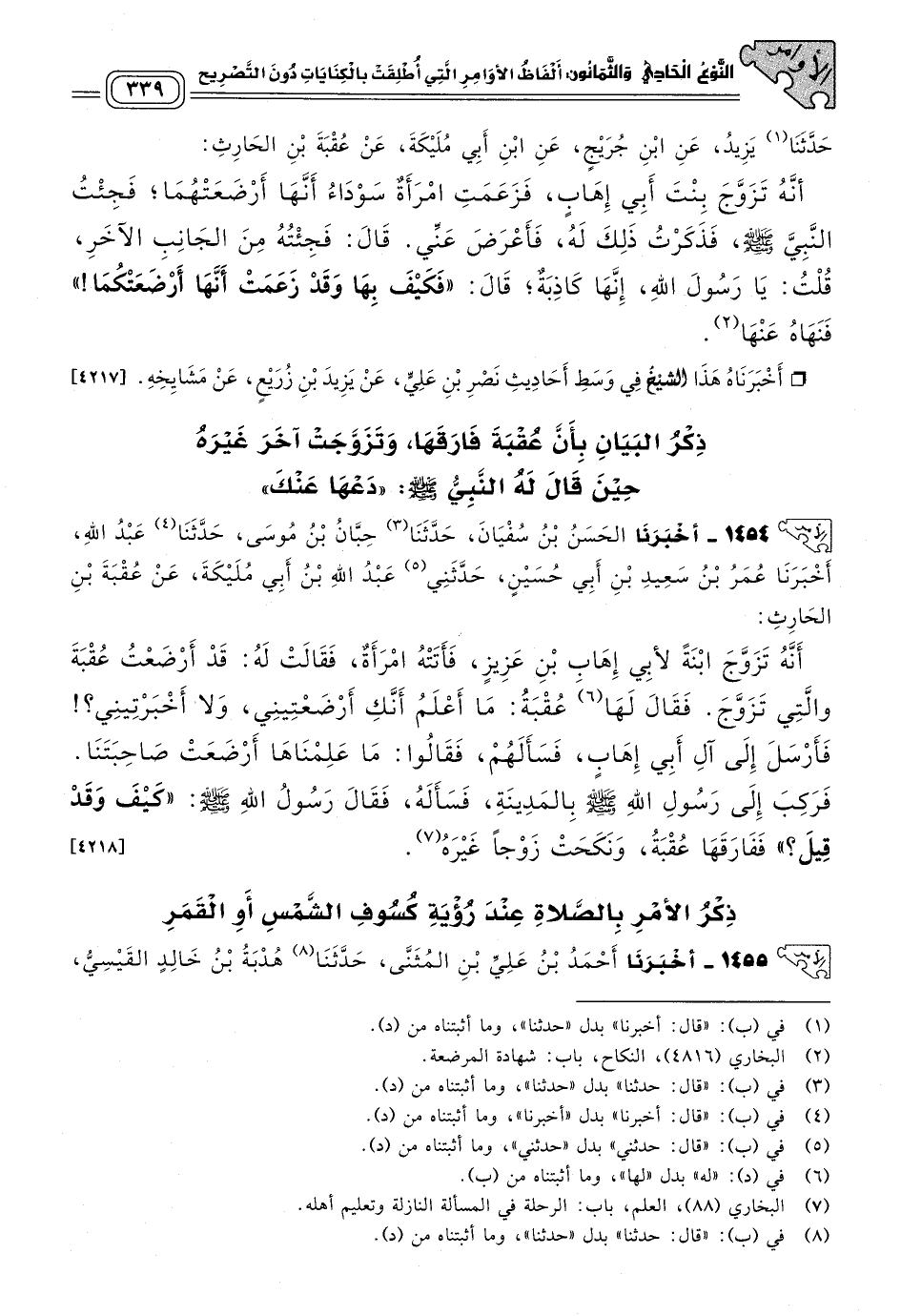 ١٤٥٤ - أَخبَرنا الْحَسَنُ بْنُ سُفْيَانَ، حَدثنا حِبَّانُ بْنُ مُوسَى، حدثنا عَبْدُ اللهِ، أَخبَرنا عُمَرُ بْنُ سَعِيدِ بْنِ أَبِي حُسَيْنٍ، حَدَّثَنِي عَبْدُ اللهِ بْنُ أَبِي مُلَيْكَةَ، عَنْ عُقْبَةَ بْنِ الْحَارِثِ، أَنَّهُ تَزَوَّجَ ابْنَةً لأَبِي إِهَابِ بْنِ عَزِيزٍ، فَأَتَتْهُ امْرَأَةٌ، فَقَالَتْ لَهُ: قَدْ أَرْضَعْتُ عُقْبَةَ وَالَّتِي تَزَوَّجَ، فَقَالَ لَهَا عُقْبَةُ: مَا أَعْلَمُ أَنَّكِ أَرْضَعْتِينِي وَلَا أَخْبَرْتِينِي، فَأَرْسَلَ إِلَى آلِ أَبِي إِهَابٍ، فَسَأَلَهُمْ، فَقَالُوا: مَا عَلِمْنَاهَا أَرْضَعَتْ صَاحِبَتَنَا، فَرَكِبَ إِلَى رَسُولِ اللهِ صَلى الله عَلَيه وسَلم بِالْمَدِينَةِ فَسَأَلَهُ، فَقَالَ رَسُولُ اللهِ صَلى الله عَلَيه وسَلم: "كَيْفَ وَقَدْ قِيلَ؟ " فَفَارَقَهَا عُقْبَةُ، وَنَكَحَتْ زَوْجًا غَيْرَهُ. [٤٢١٨]