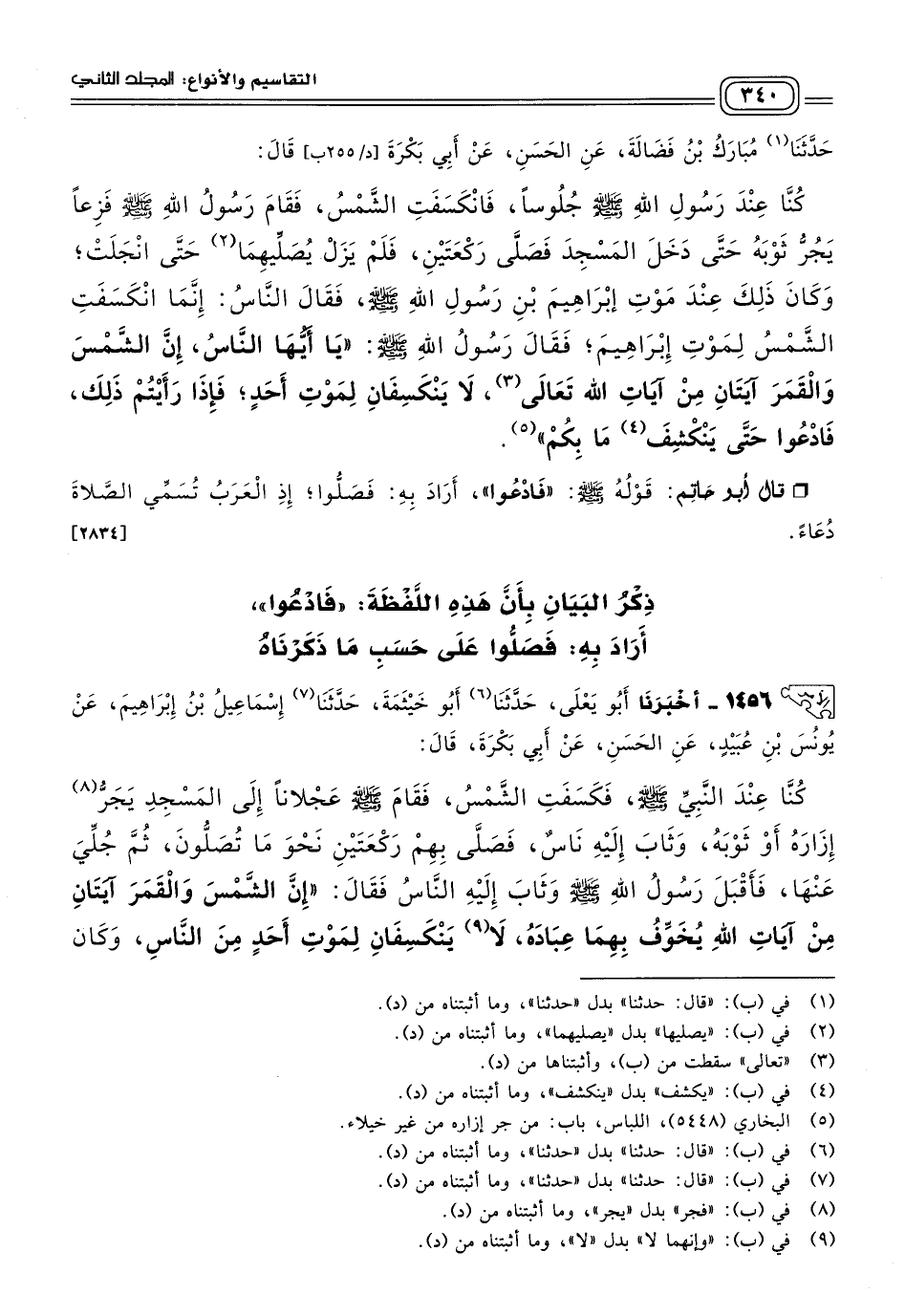 قَالَ أَبُو حَاتِمٍ رَضِيَ اللهُ عَنْهُ: قَوْلُ أَبِي بَكْرَةَ: فَصَلَّى بِهِمْ رَكْعَتَيْنِ نَحْوَ مَا تُصَلُّونَ، أَرَادَ بِهِ كما تُصَلُّونَ صَلَاةَ الْكُسُوفِ رَكْعَتَيْنِ فِي أَرْبَعِ رَكَعَاتٍ، وَأَرْبَعِ سَجَدَاتٍ عَلَى حَسَبِ مَا تَقَدَّمَ ذِكْرُنَا لَهُ. [٢٨٣٥]